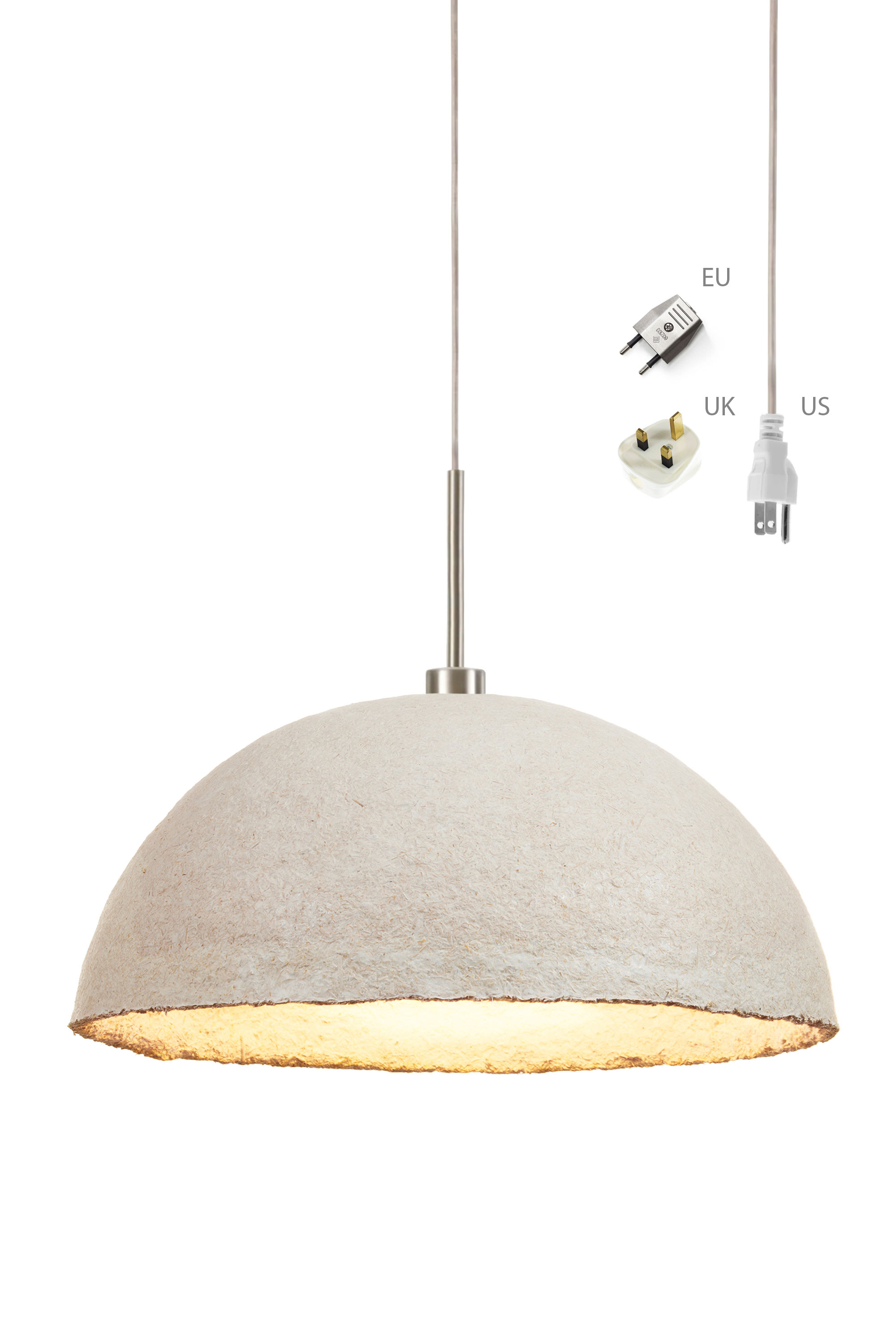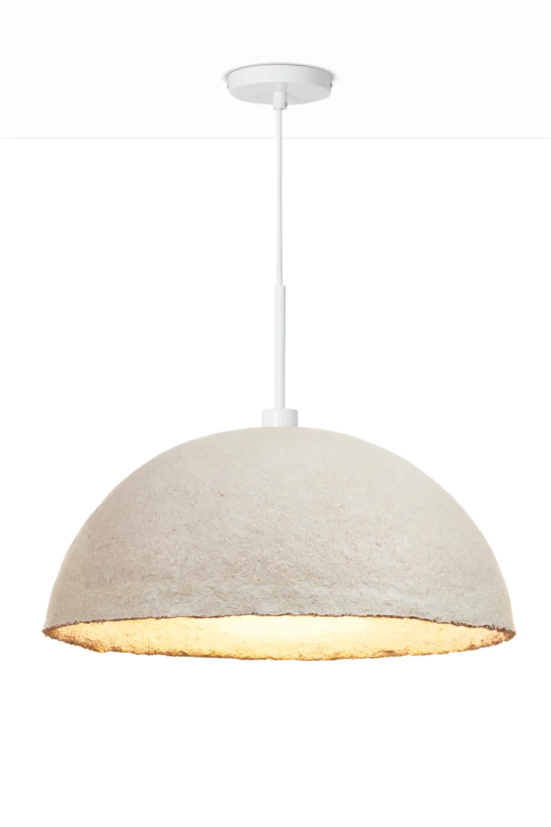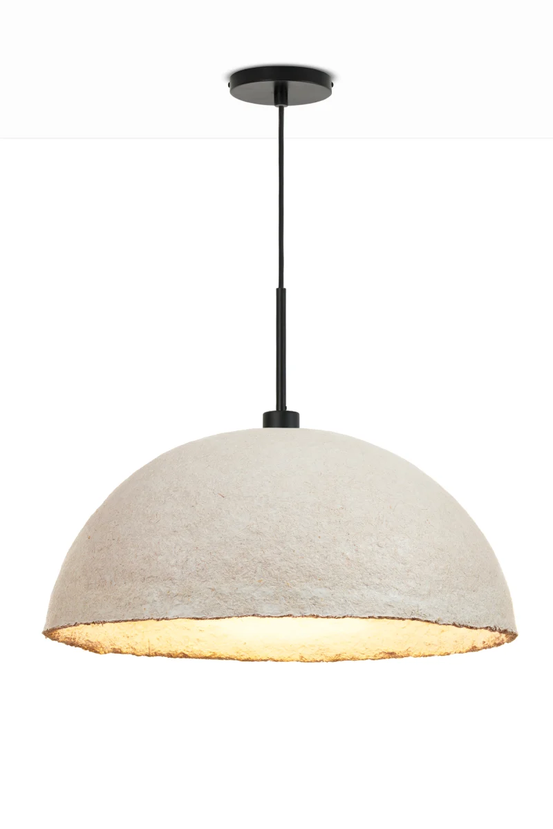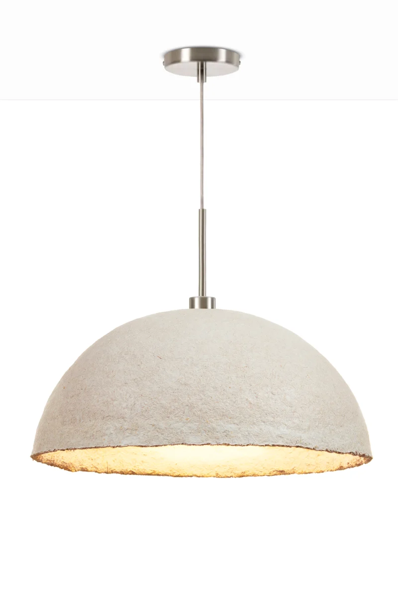 Our most popular fixture, the MushLume Hemi Pendant, features a 23” diameter dome handcrafted from carbon-sequestering hemp and living mushroom mycelium. Perfect for eco-conscious spaces, this sustainable hanging lamp offers a nature-inspired design that creates a lasting impression.