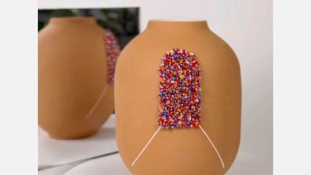 These multiple variations are interpreted and expressed in material form through mixed techniques of embroidery on silk, and sewn-on ceramics.