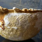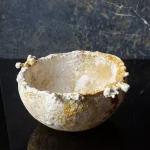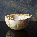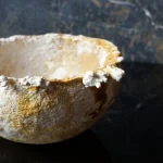 this bowl is organically grown from the mycelium of a regional medicinal mushroom and is comparable to wooden bowls for storing and serving dry food. i am fascinated by its lively texture and natural coloring, as well as its lightness and toughness. its weight and stability are comparable to cork, the surface is reminiscent of leather and it can be treated and cared for in the same way, for example with oil and wax. the surface of this example is untreated and yet already water-repellent, even if permanent contact with liquids would soften the material.