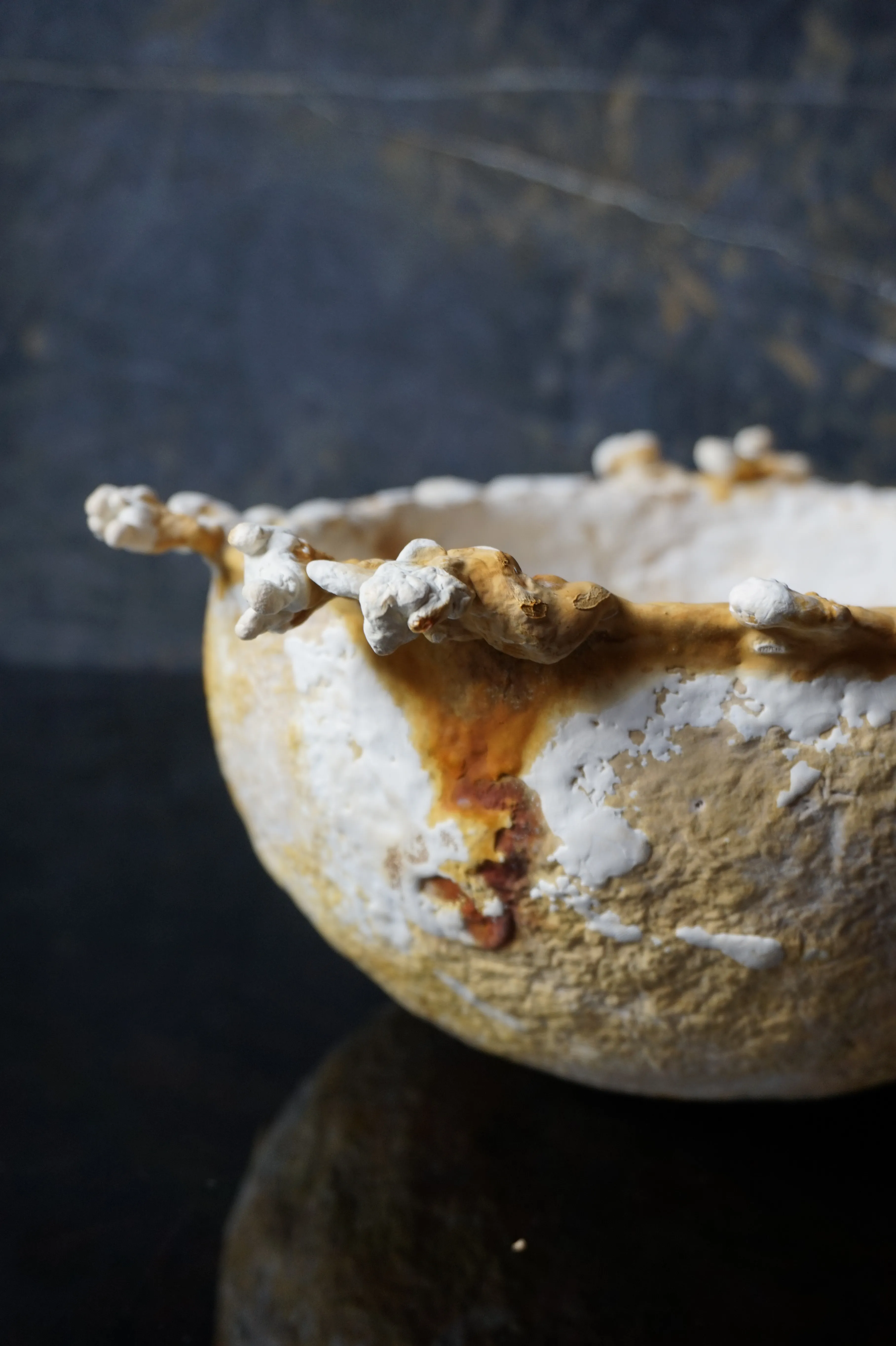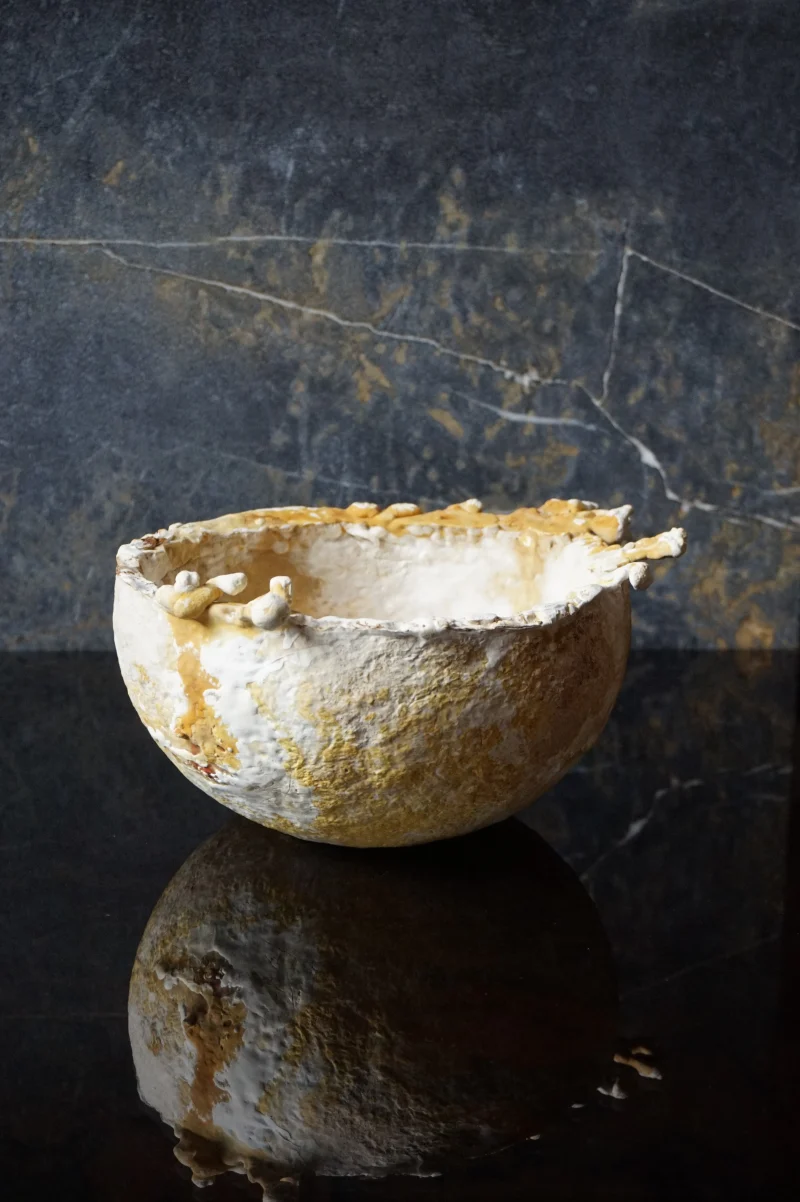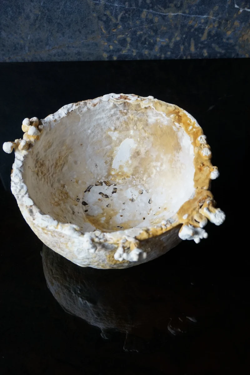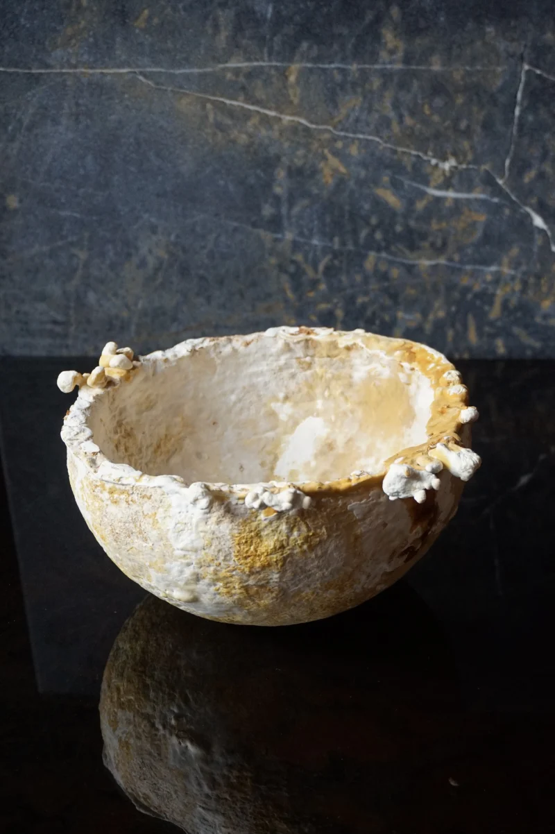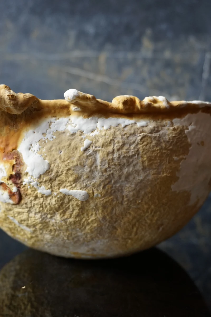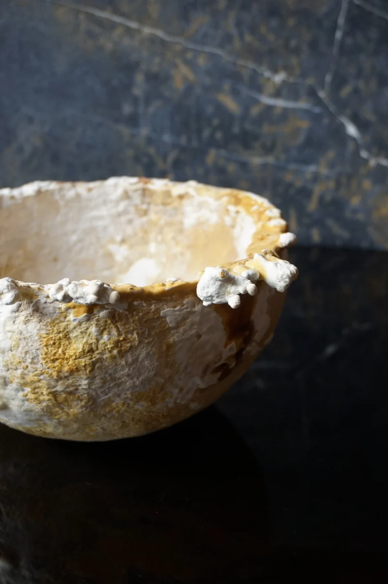 this bowl is organically grown from the mycelium of a regional medicinal mushroom and is comparable to wooden bowls for storing and serving dry food. i am fascinated by its lively texture and natural coloring, as well as its lightness and toughness. its weight and stability are comparable to cork, the surface is reminiscent of leather and it can be treated and cared for in the same way, for example with oil and wax. the surface of this example is untreated and yet already water-repellent, even if permanent contact with liquids would soften the material.