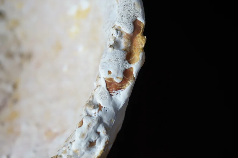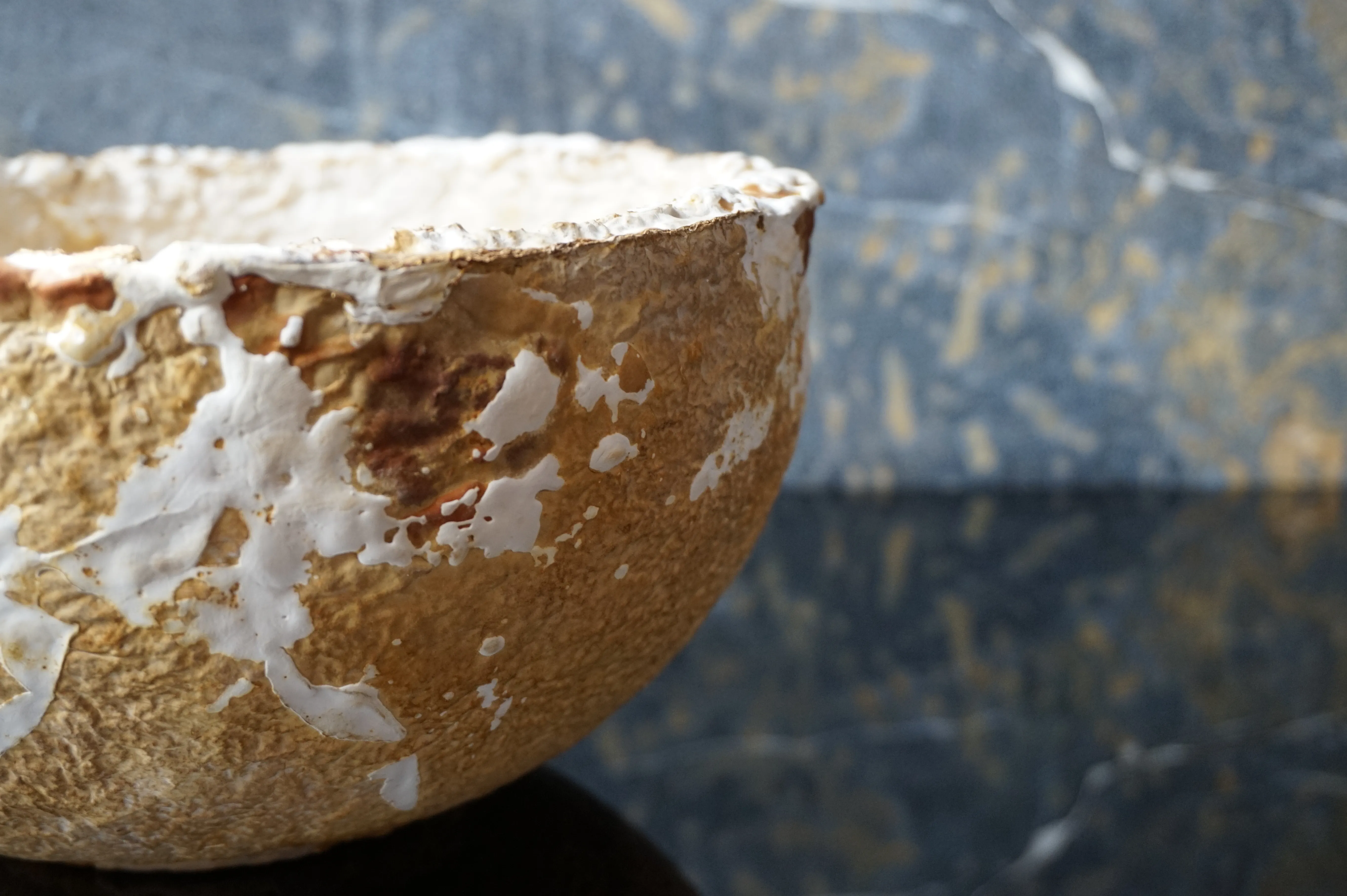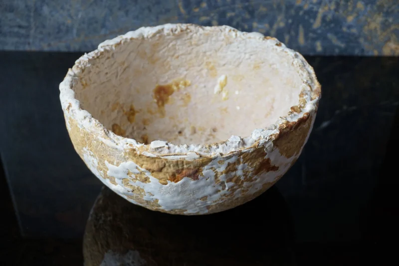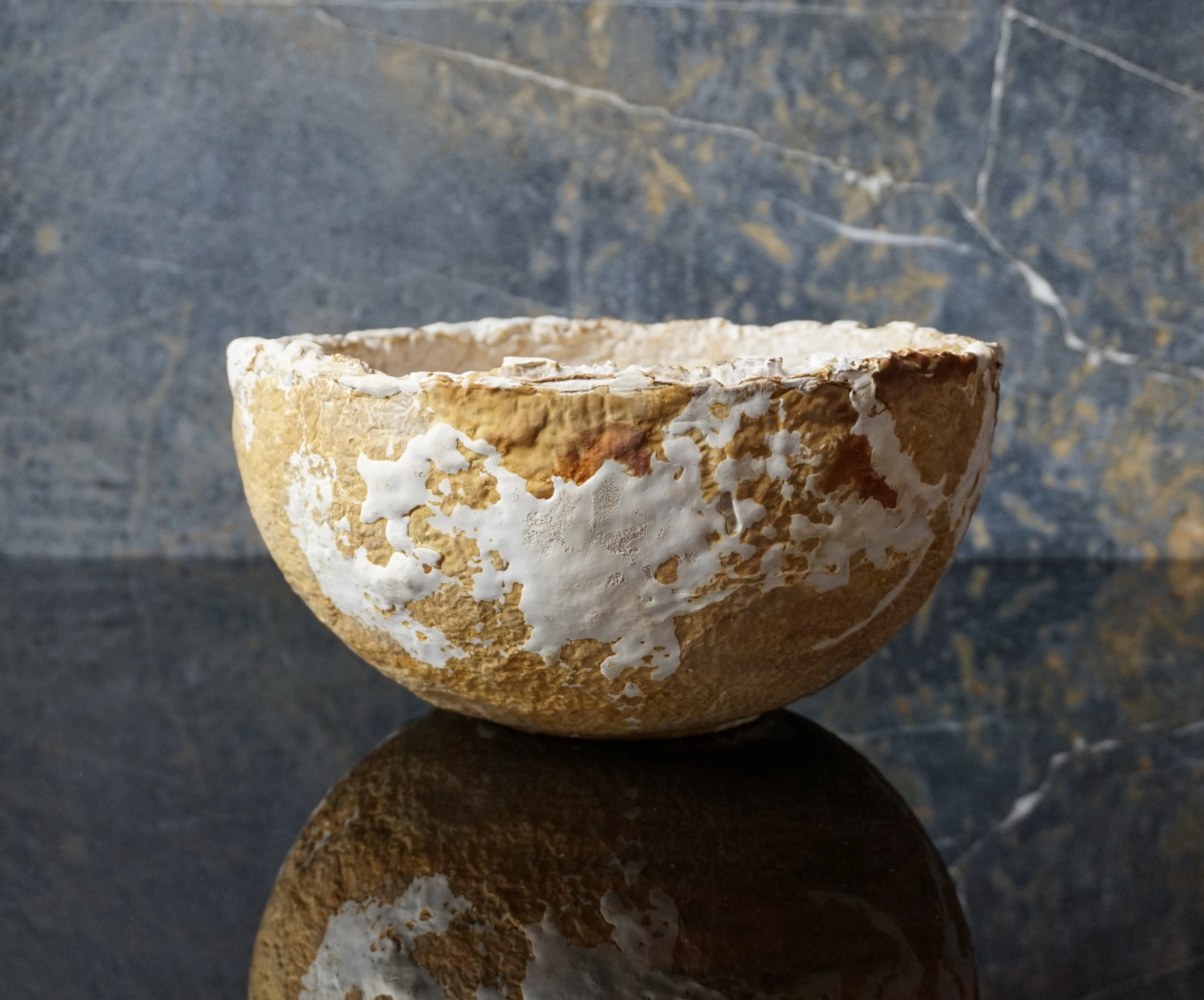 this bowl is organically grown from the mycelium of a regional medicinal mushroom and is comparable to wooden bowls for storing and serving dry food. i am fascinated by its lively texture and natural coloring, as well as its lightness and toughness. its weight and stability are comparable to cork, the surface is reminiscent of leather and it can be treated and cared for in the same way, for example with oil and wax. the surface of this example is untreated and yet already water-repellent, even if permanent contact with liquids would soften the material.