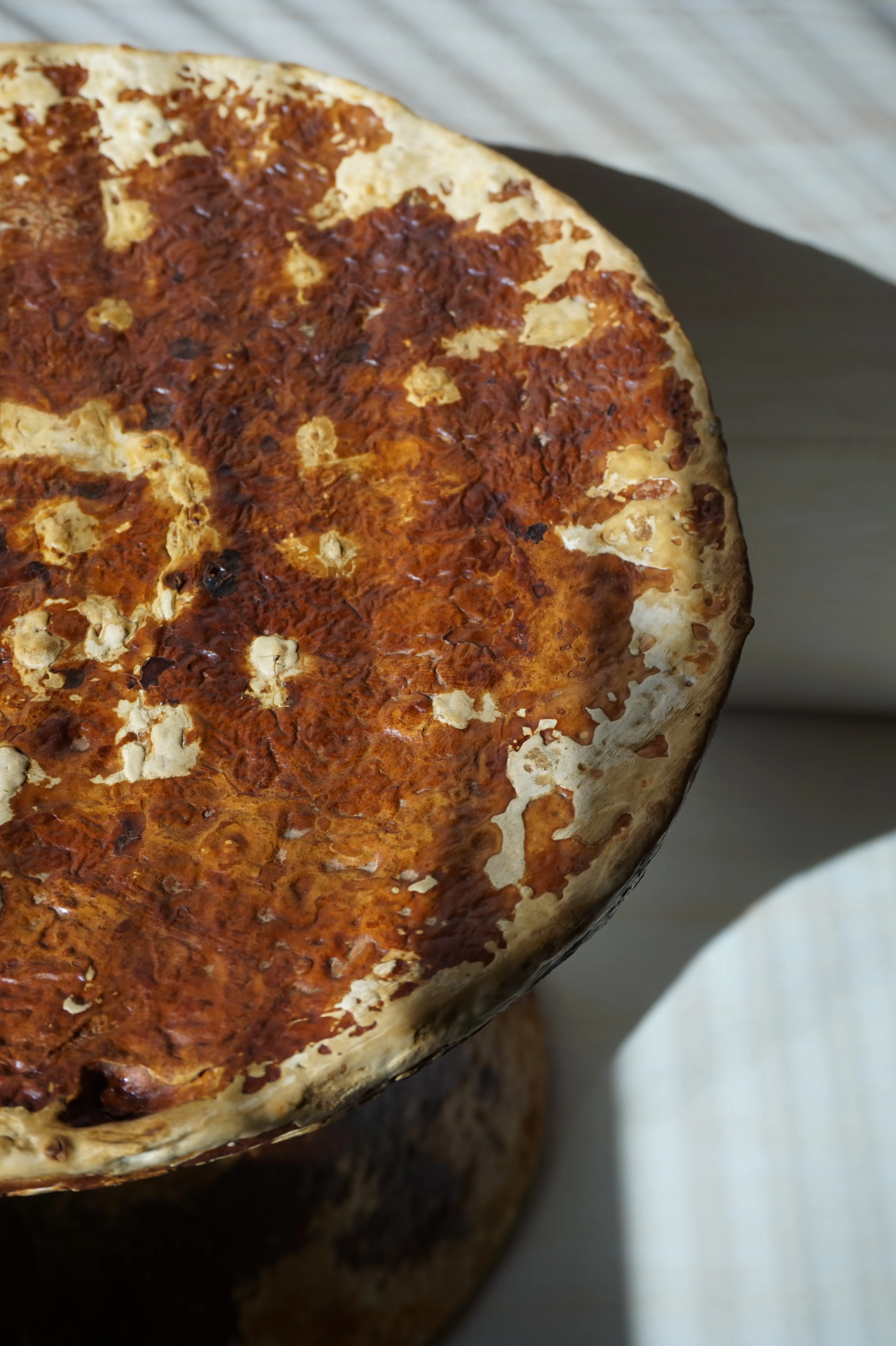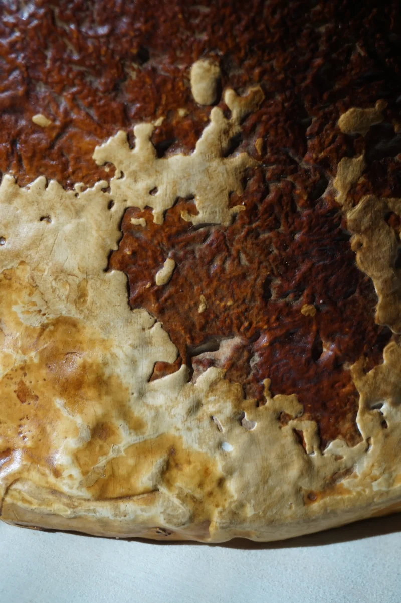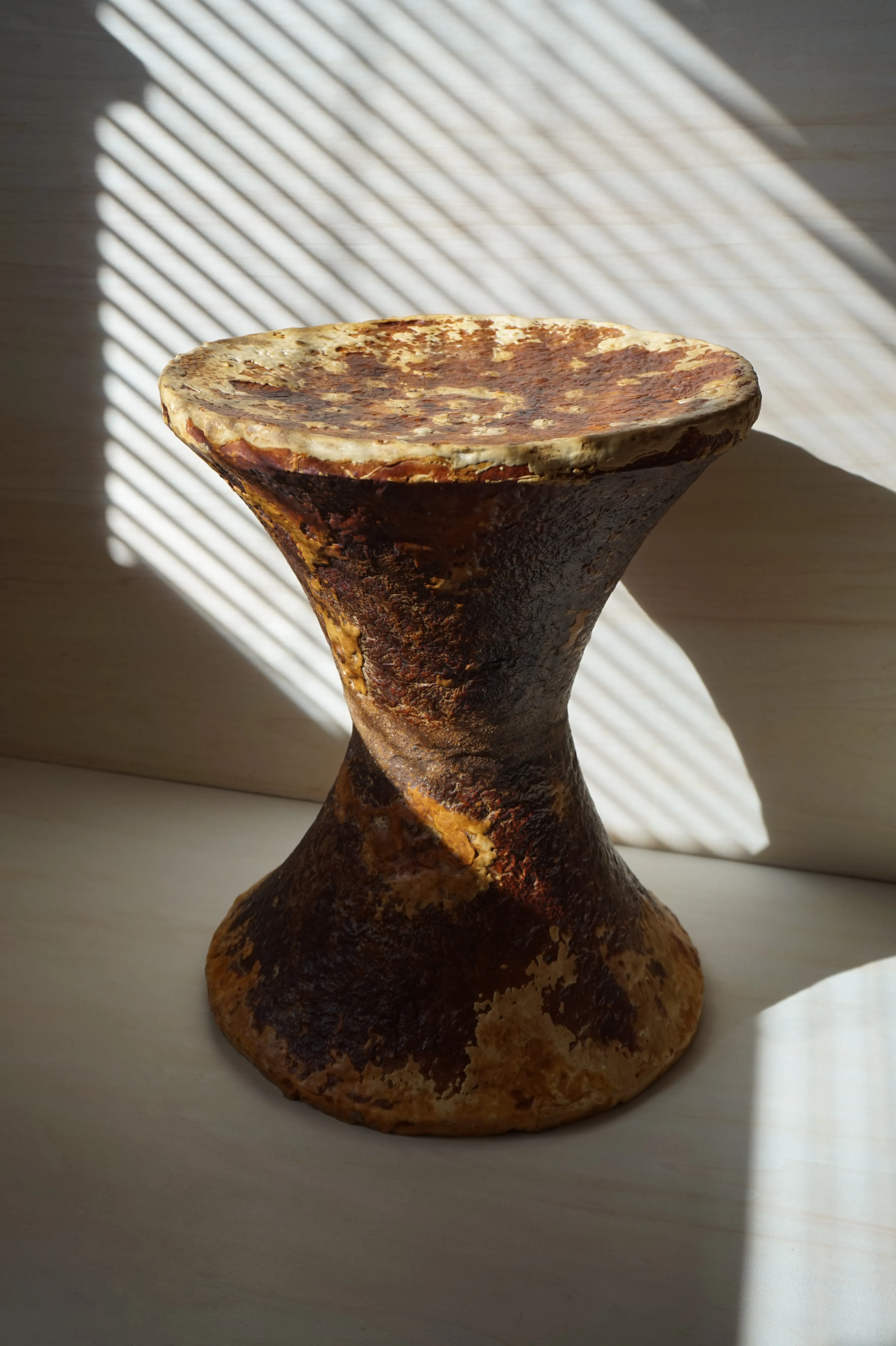 this stool is organically grown from the mycelium of a regional tinder fungus, reinforced with earth concrete. i am fascinated by its lively texture and natural coloring, as well as its lightness and toughness. its weight and stability are comparable to cork, the surface is reminiscent of leather and it can be treated and cared for in the same way, for example with oil and wax. the surface of this piece is treated and yet already water-repellent.