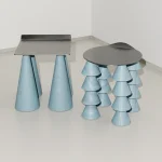 Crafted with a commitment to quality and longevity, the collection is timeless. Produced in the studio’s atelier, it involves skilled local artisans, showcasing their craftsmanship. The stools are made from Brazilian Tauari wood, shaped by hand and colored in a serene sky-blue hue. The satin finish comes from a low VOC blend of wax and oil, while the seats are made of carefully shaped and bent steel.