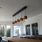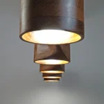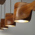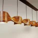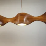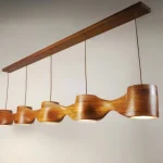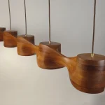 The N2-5 Pendant Lamp by Aaron Scott consists of five dimmable LED lamps housed in a continuous, carved-out teak body. The lamp hangs via lamp wires attached to a canopy (teak or metal), which mounts to a standard junction box. Hanging height can be customized.