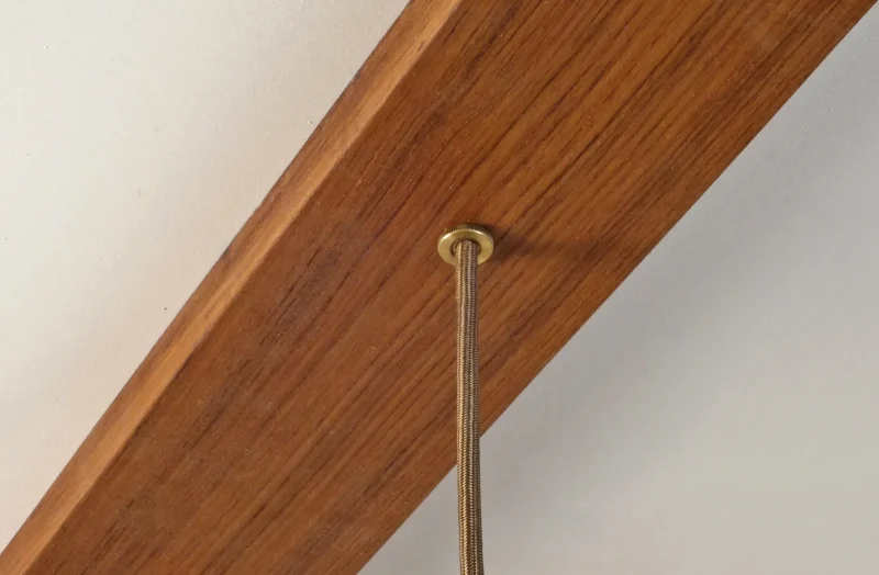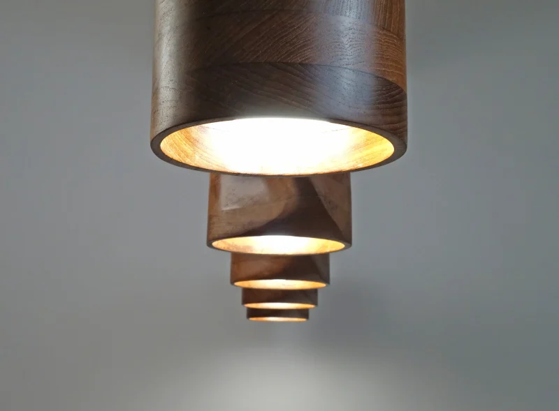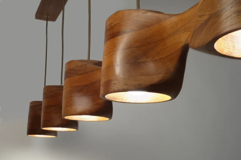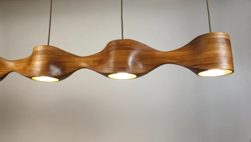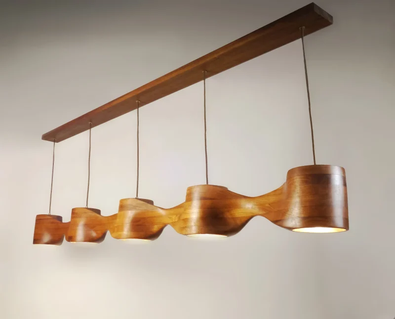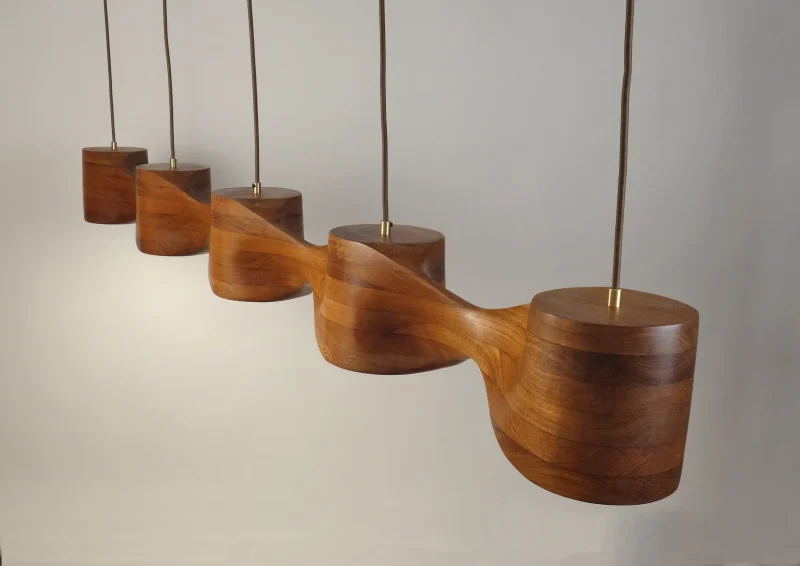 The N2-5 Pendant Lamp by Aaron Scott consists of five dimmable LED lamps housed in a continuous, carved-out teak body. The lamp hangs via lamp wires attached to a canopy (teak or metal), which mounts to a standard junction box. Hanging height can be customized.