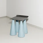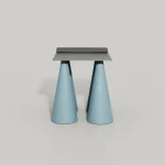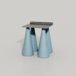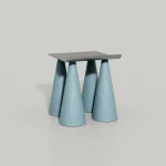 Crafted with a commitment to quality and longevity, the collection is timeless. Produced in the studio’s atelier, it involves skilled local artisans, showcasing their craftsmanship. The stools are made from Brazilian Tauari wood, shaped by hand and colored in a serene sky-blue hue. The satin finish comes from a low VOC blend of wax and oil, while the seats are made of carefully shaped and bent steel.