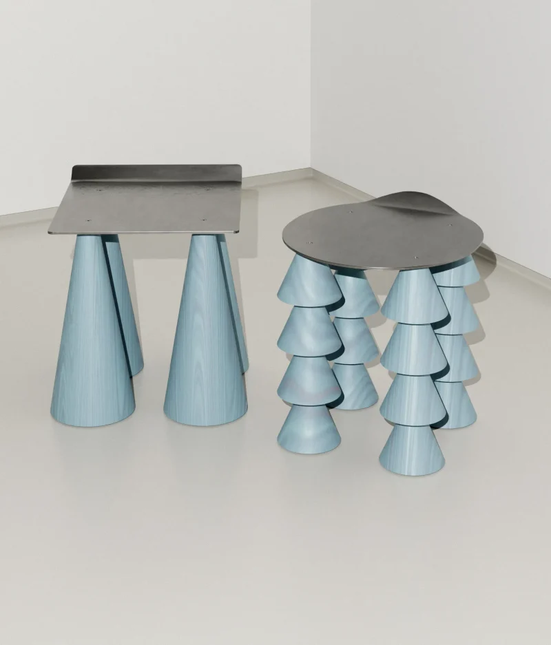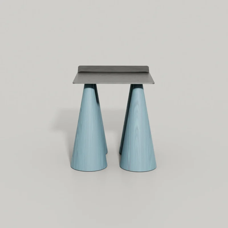 Crafted with a commitment to quality and longevity, the collection is timeless. Produced in the studio’s atelier, it involves skilled local artisans, showcasing their craftsmanship. The stools are made from Brazilian Tauari wood, shaped by hand and colored in a serene sky-blue hue. The satin finish comes from a low VOC blend of wax and oil, while the seats are made of carefully shaped and bent steel.
