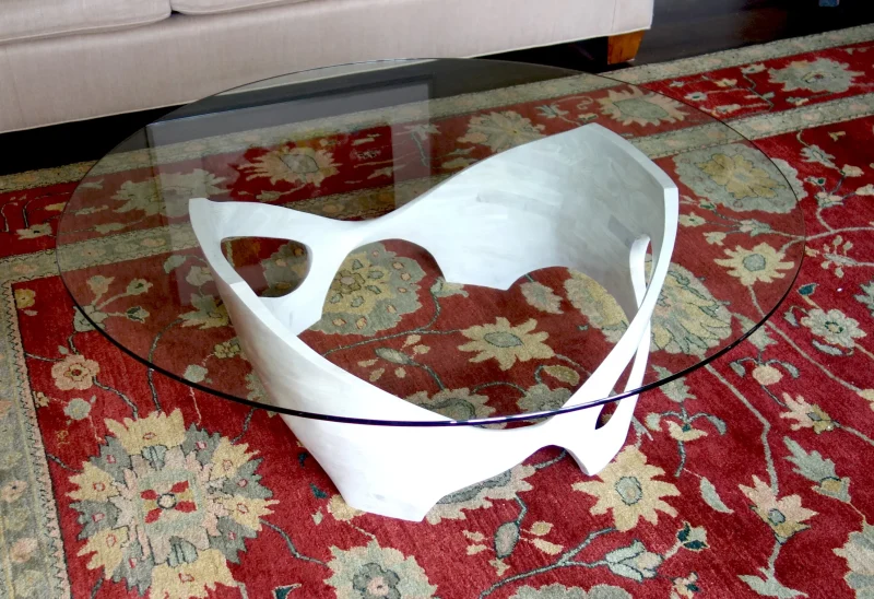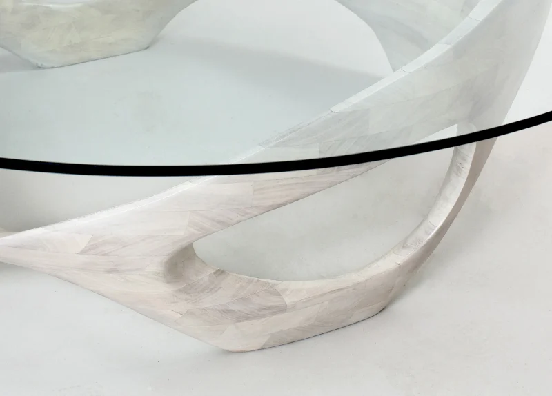 The N2 Coffee Table by Aaron Scott consists of a twisting, bone-like wooden base, which supports a 3/8″ tempered glass top.
