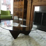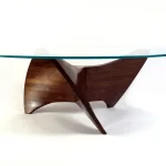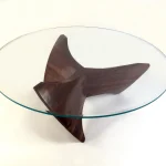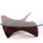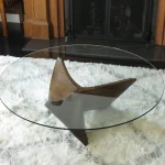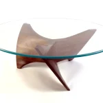 The wood is walnut, finished with a satin lacquer. The 48″ round glass top is tempered with polished edges.
