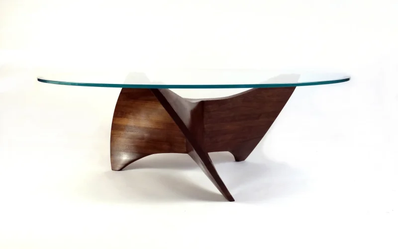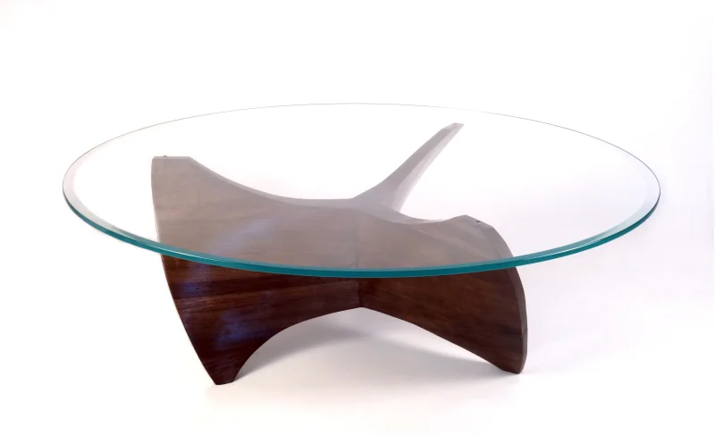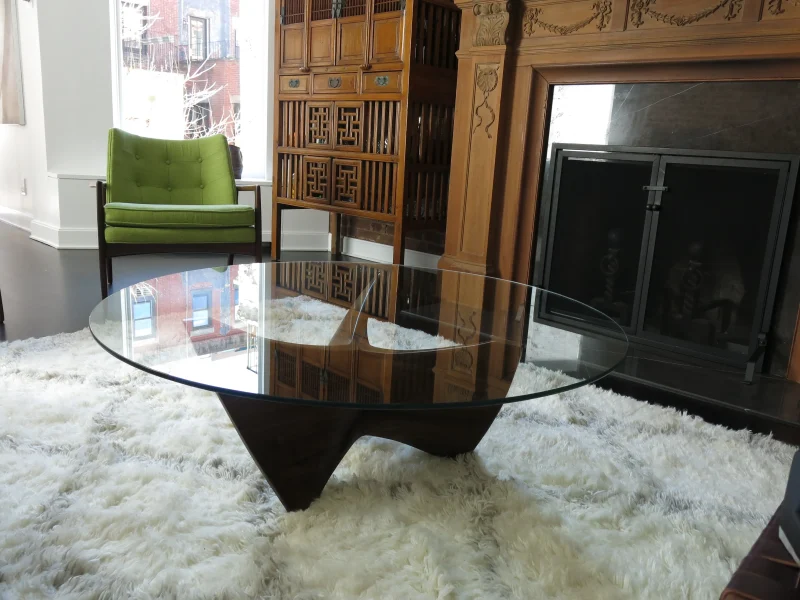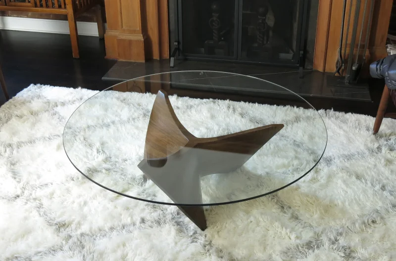 The wood is walnut, finished with a satin lacquer. The 48″ round glass top is tempered with polished edges.