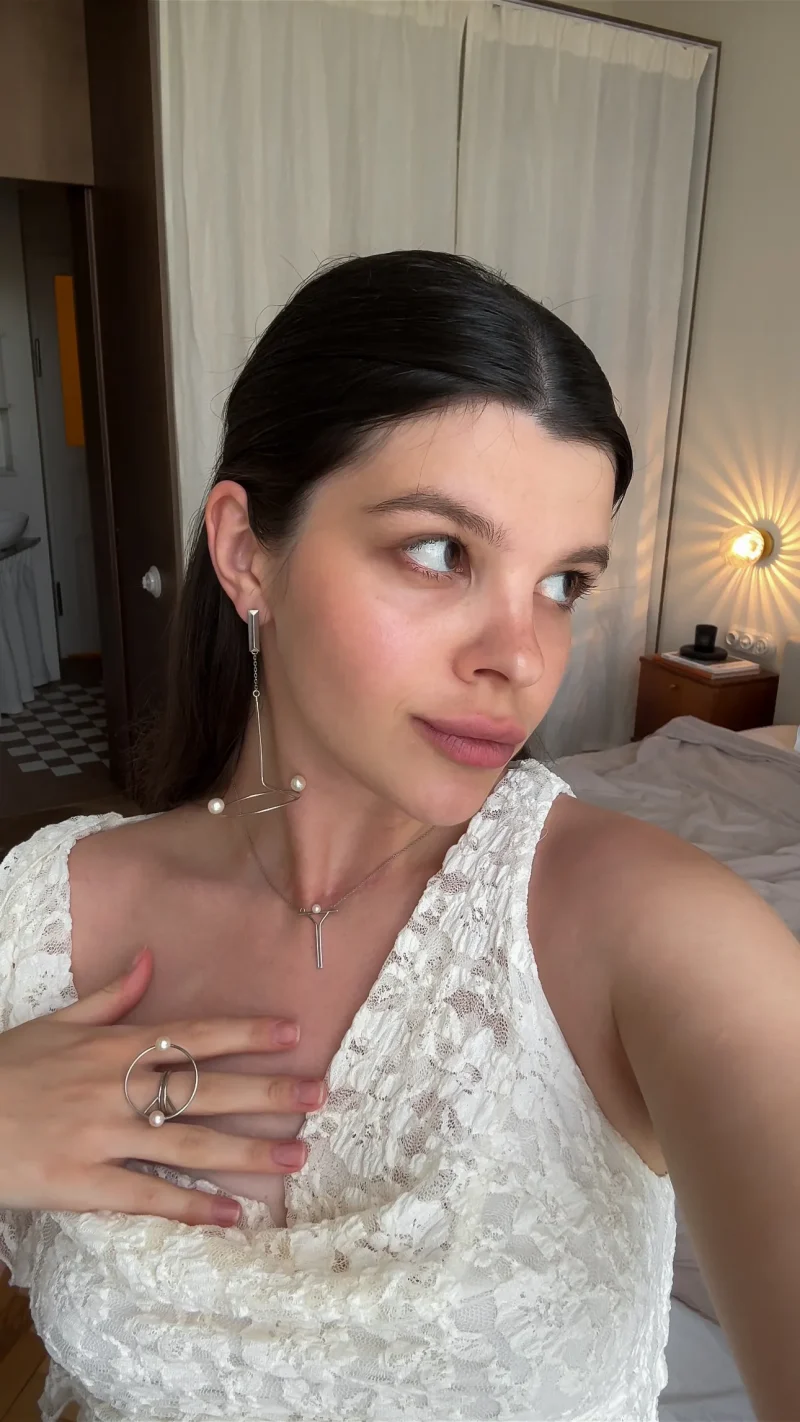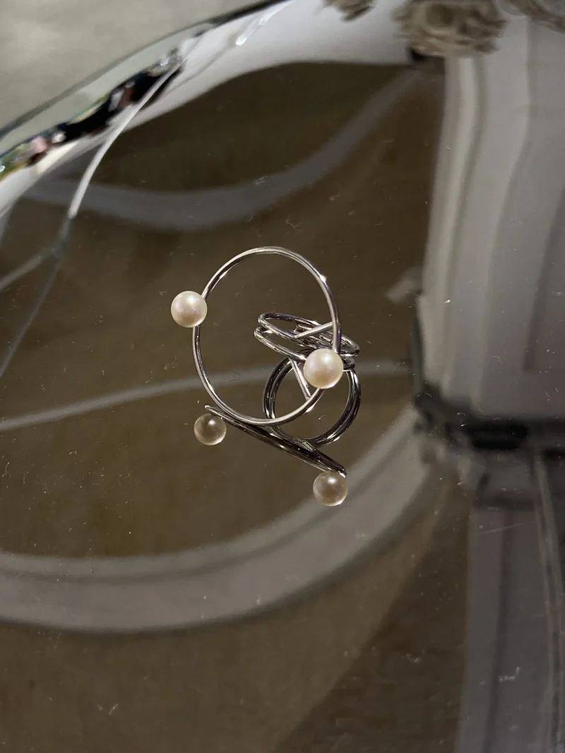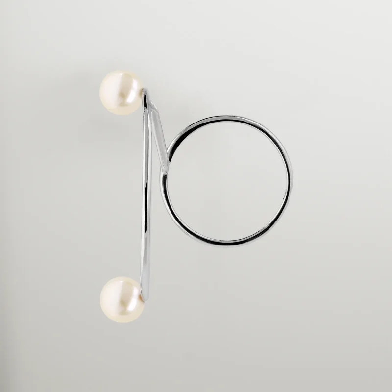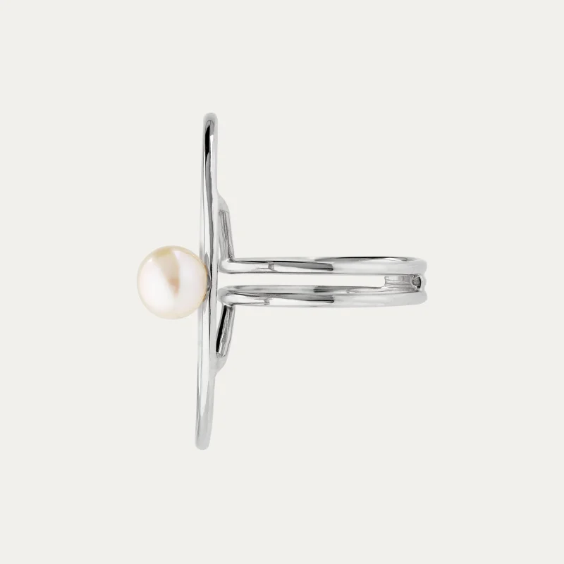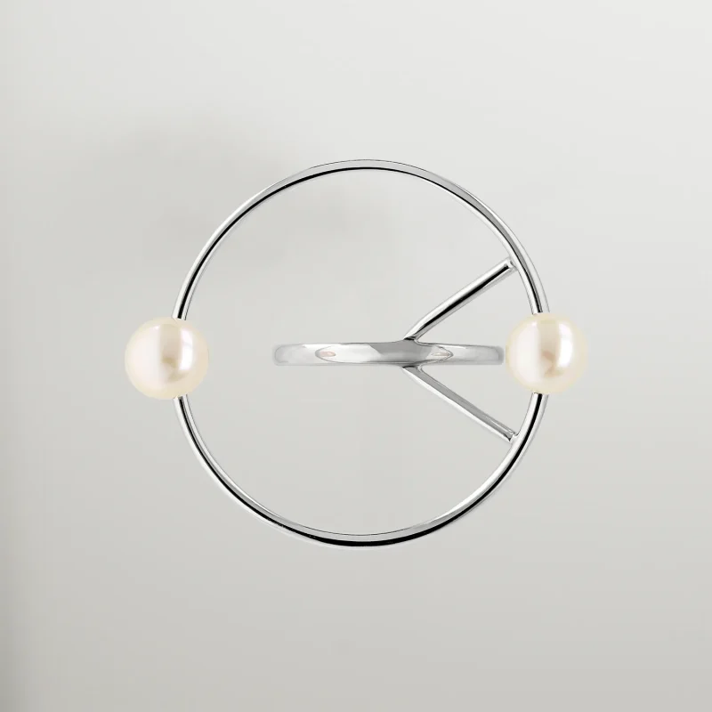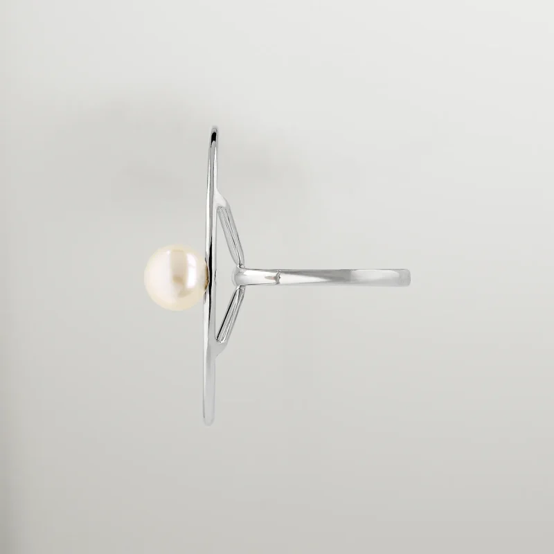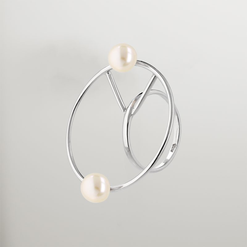 Pure geometric figures build elegant jewelry; silver lines and a circle at the top contain the pearl. The final result is a lightweight design out of 925 sterling silver and natural pearls, a solid, gracefully sustainable material.