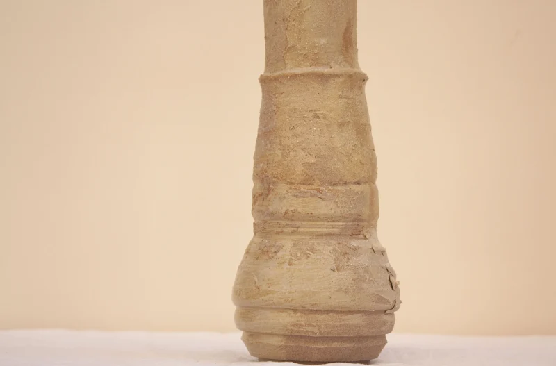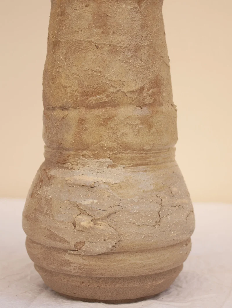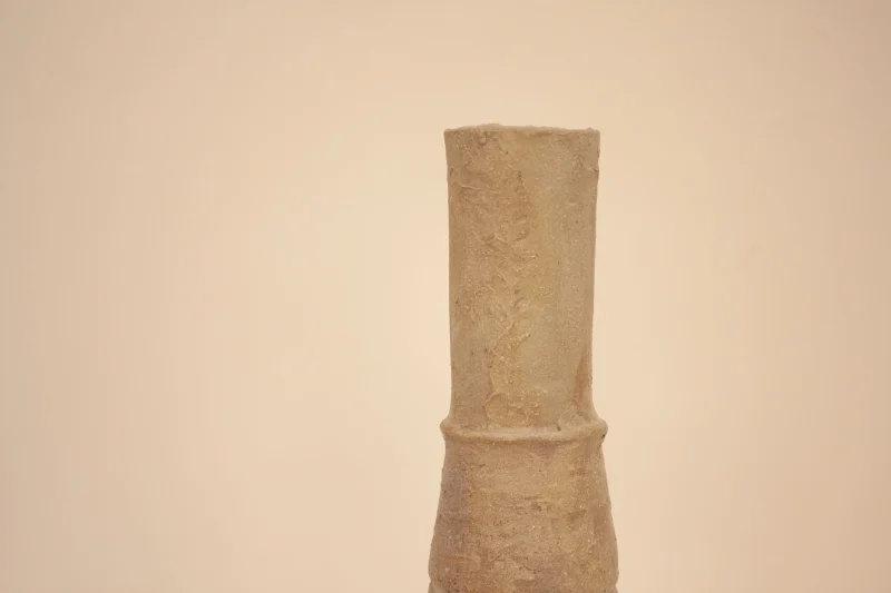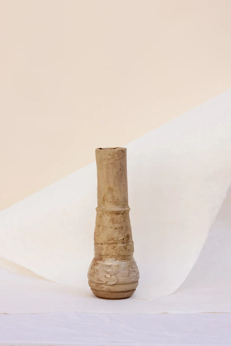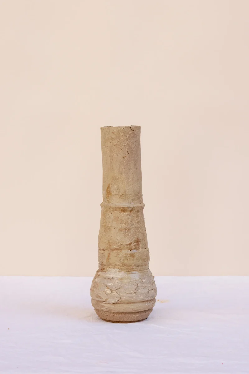 The Naiaides 3 by Volupte Studio presents a strikingly minimalistic design with a strong emphasis on texture and form. The piece has a tall, cylindrical shape that narrows slightly towards the top, creating a subtle sense of elongation. Its surface is rough and uneven, showcasing a natural, earthy beige tone that evokes a raw, organic aesthetic. The vase’s texture is accentuated by small ridges and irregularities, giving it a weathered, almost ancient appearance. The base is slightly wider and features gentle, layered contours that add a grounding element to the otherwise slender form. This vase is a perfect example of understated elegance, making it an ideal piece for those who appreciate simplicity and natural beauty in their decor.