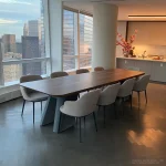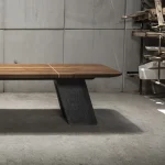 Nashii is a meticulously designed dining table crafted to seamlessly blend with any interior. Its two bases are constructed upon monoliths of volcanic stone, adding a sense of sturdiness to the piece. These bases, with their sculptural features, provide a solid and visually striking support for the solid wood top that connects them. The combination of these natural elements creates a dining table that is not only functional but also a compelling centerpiece that enhances any space with its presence.