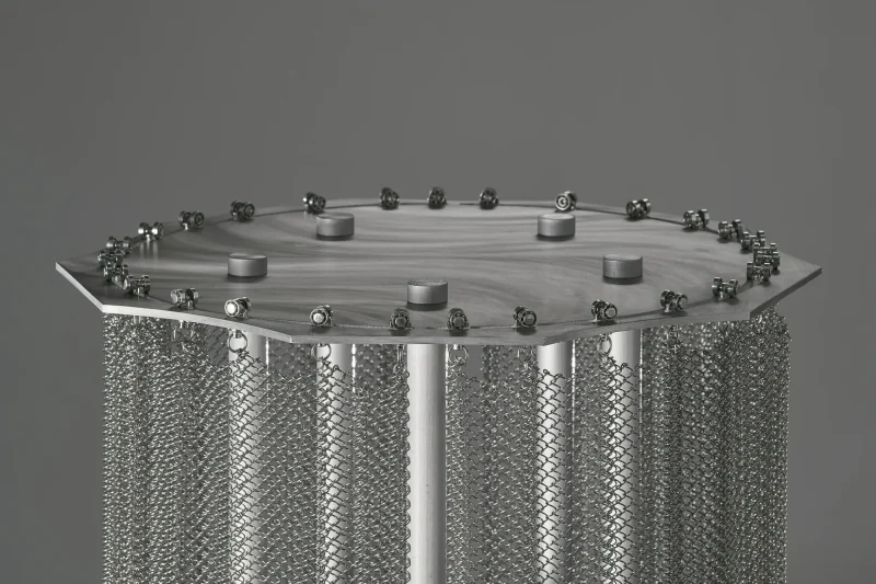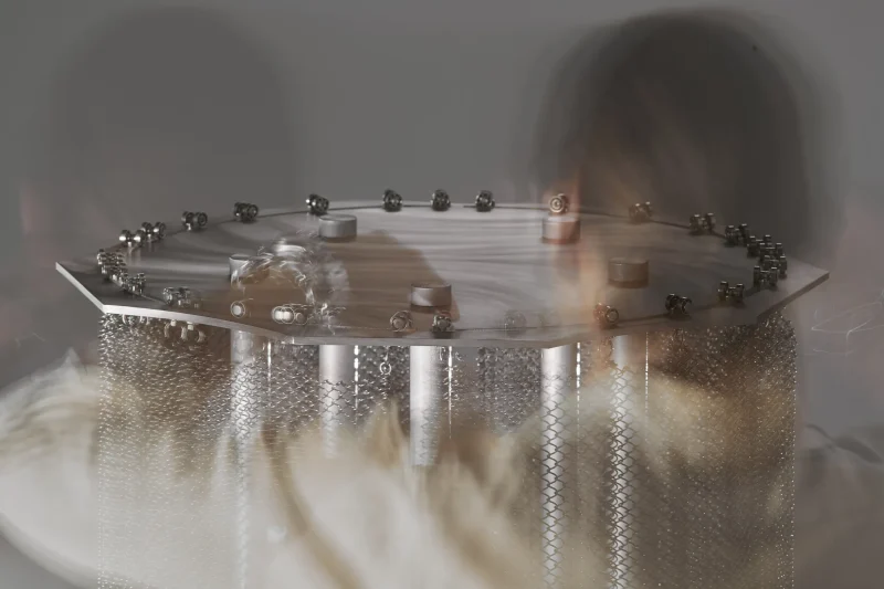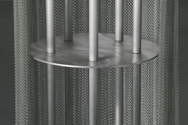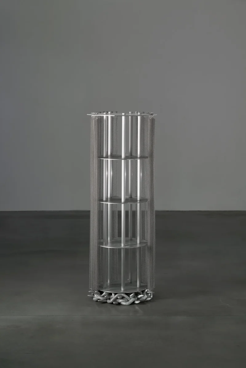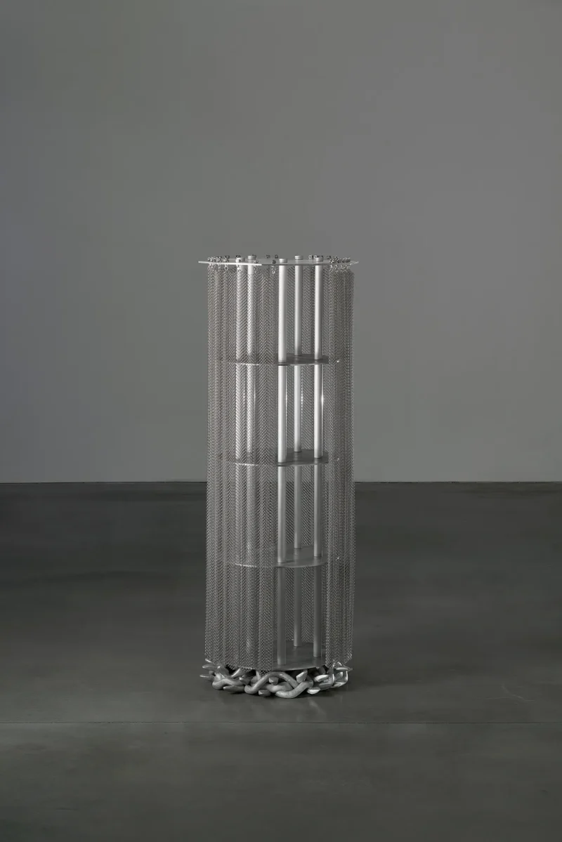 The mesh curtain, suspended by exposed bearings, functions as a delicate shroud, evocative of a snake’s shed skin. This layered duality speaks to broader themes of containment, transformation, and cyclical renewal, drawing connections between natural and constructed realms.
