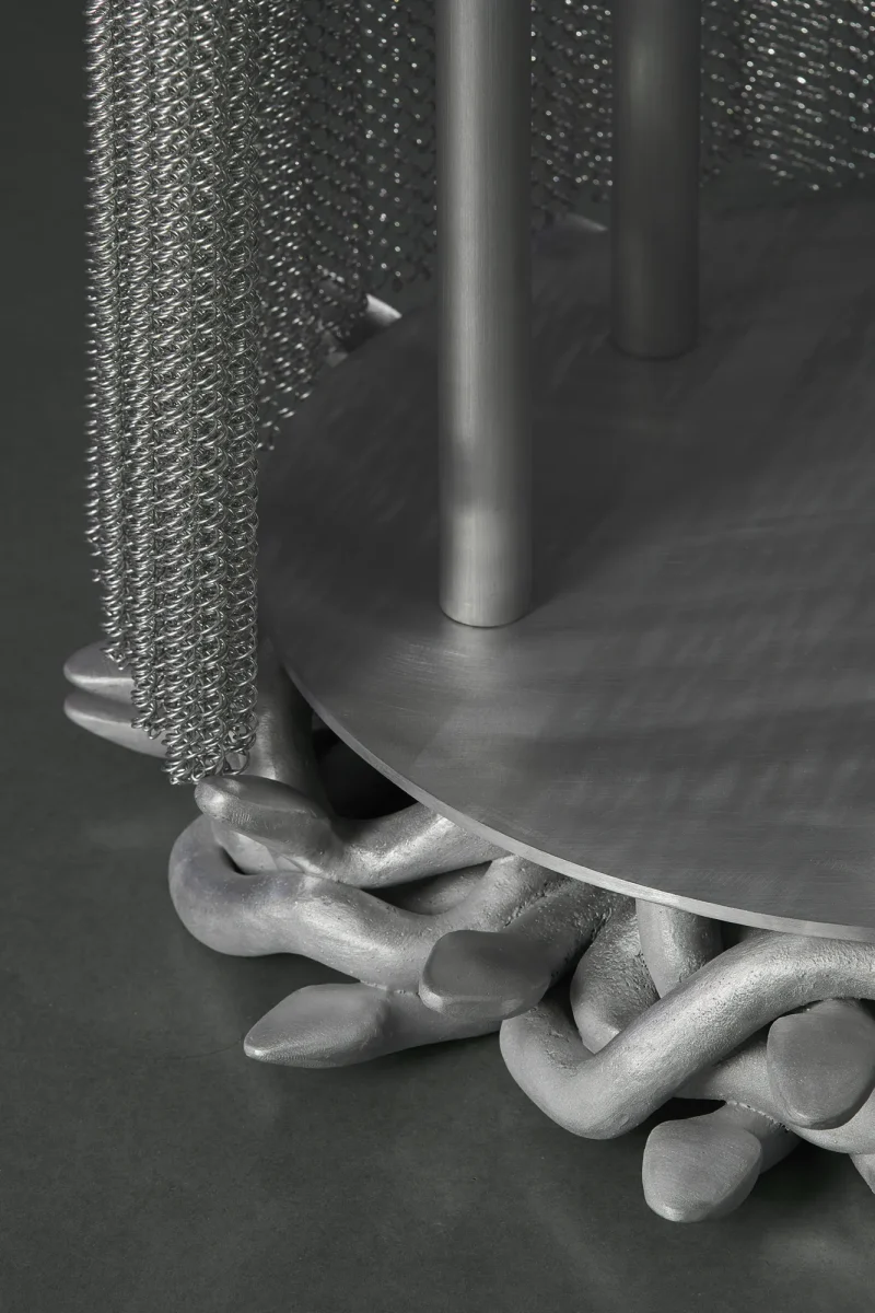 The Natrix Natrix Bar Cabinet is a sculptural yet functional piece designed to hold bottles and glasses, evoking the sinuous, serpentine form of the common grass snake (Natrix natrix). Part of the Slipcover Collection, it navigates the interplay between solidity and transparency, employing perforated aluminum mesh that simultaneously reveals and conceals its contents, creating a compelling tension between visibility and obscurity.
