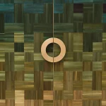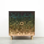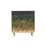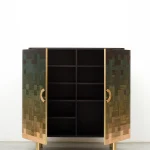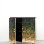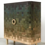 Through the prism of simplification, the cabinet in the Forest color scheme reflects the power of the dense forest. The base is made of solid oak. The tabletop has a pronounced wood texture and patina blackening. The facades of the cabinet are inlaid with colored straw, with a gradient from earth black to golden wheat. Poles and half-rings handles are made of polished brass.