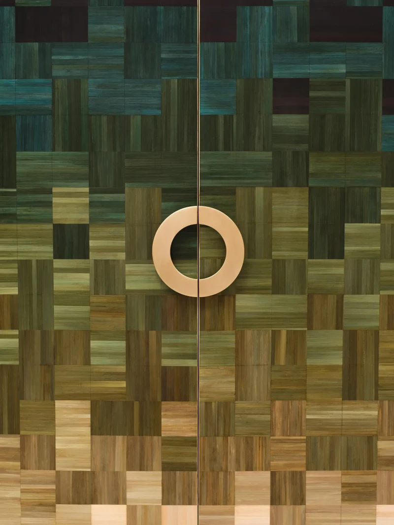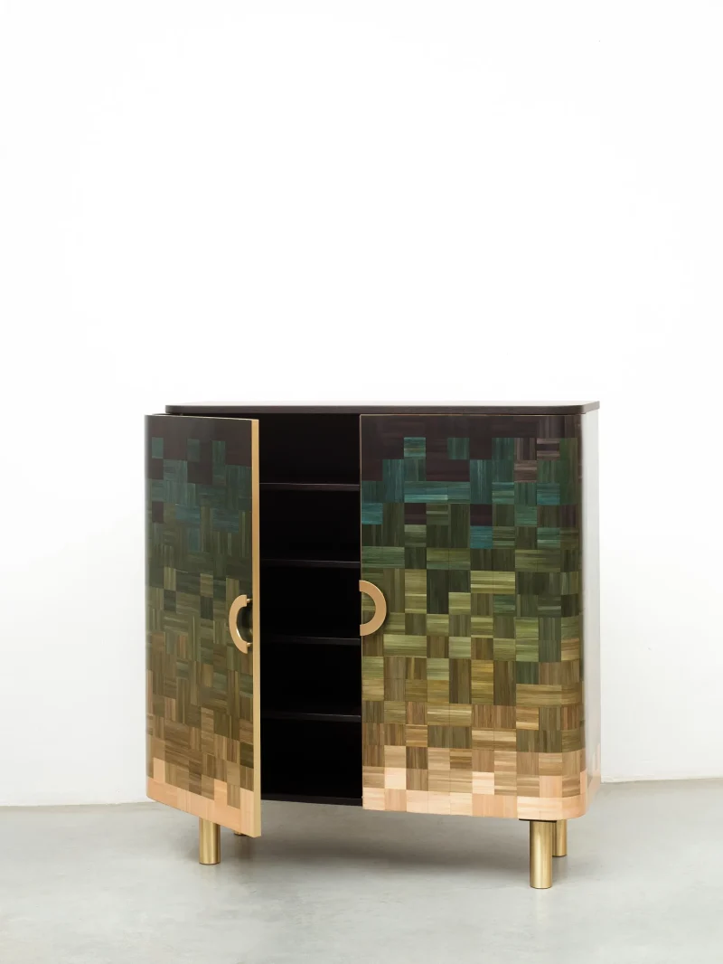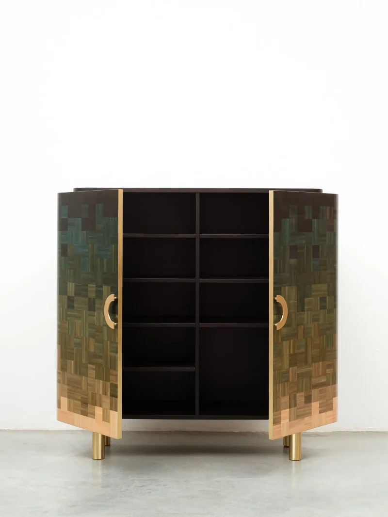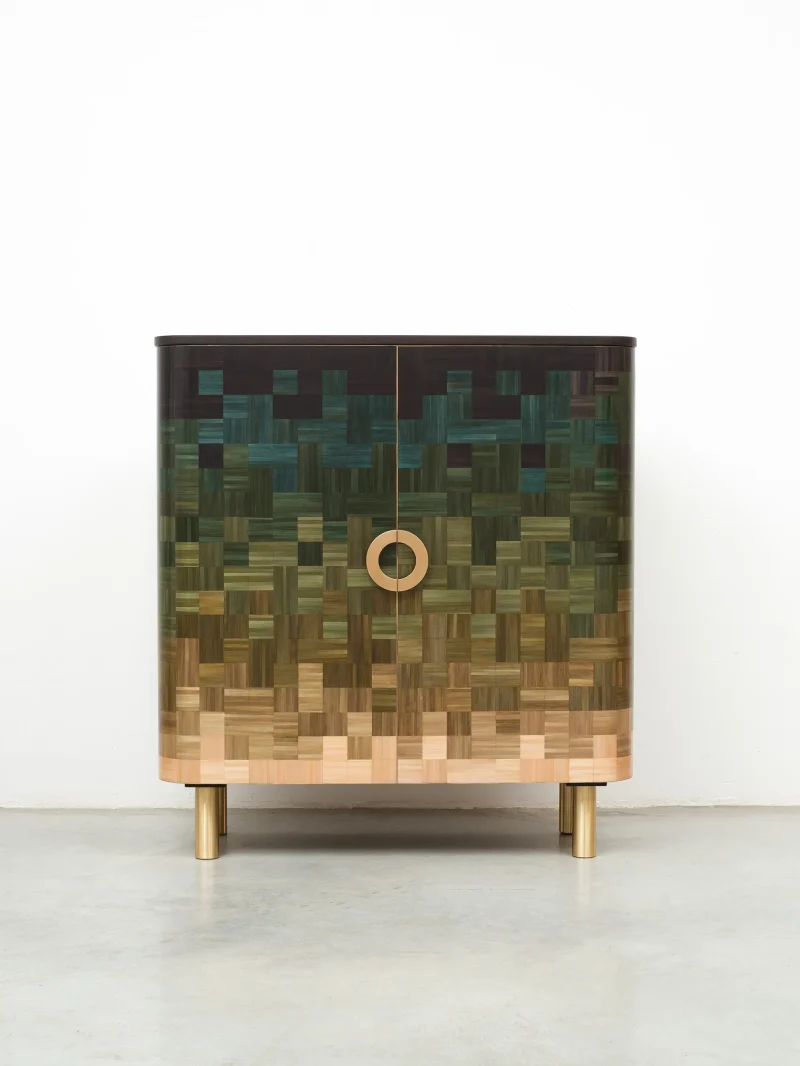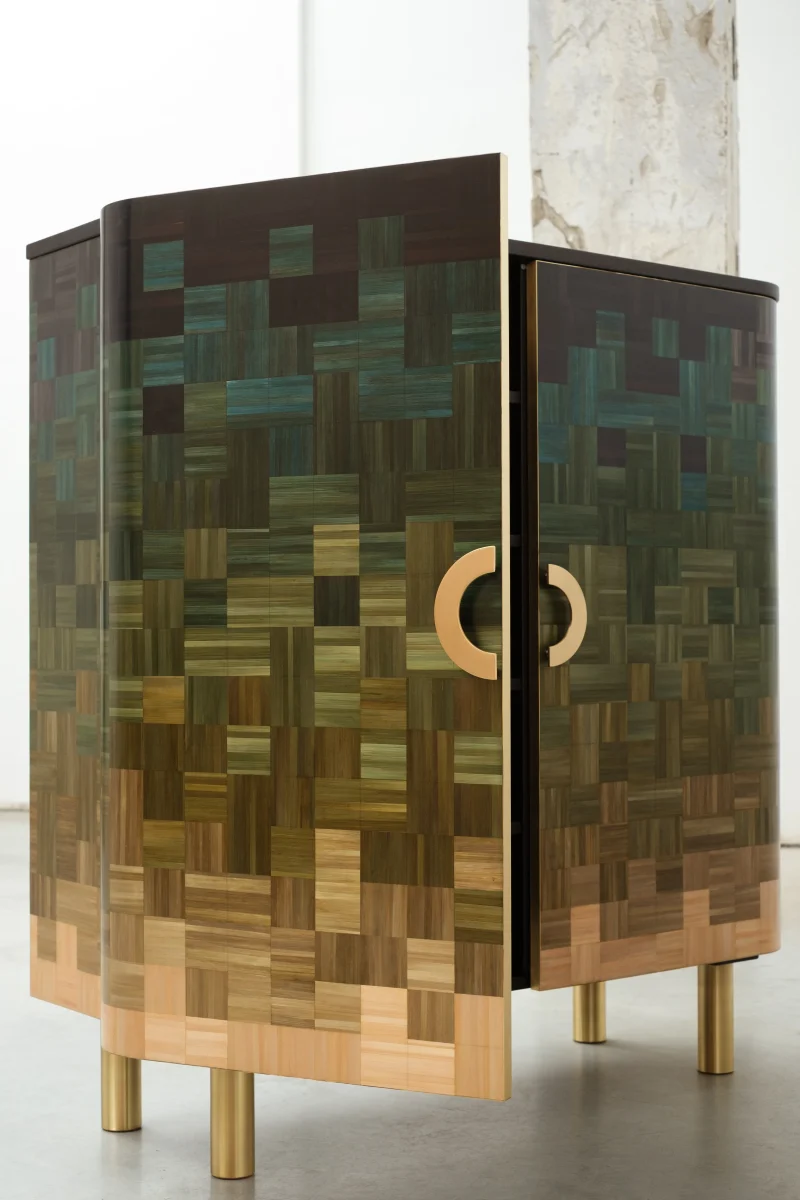 Through the prism of simplification, the cabinet in the Forest color scheme reflects the power of the dense forest. The base is made of solid oak. The tabletop has a pronounced wood texture and patina blackening. The facades of the cabinet are inlaid with colored straw, with a gradient from earth black to golden wheat. Poles and half-rings handles are made of polished brass.