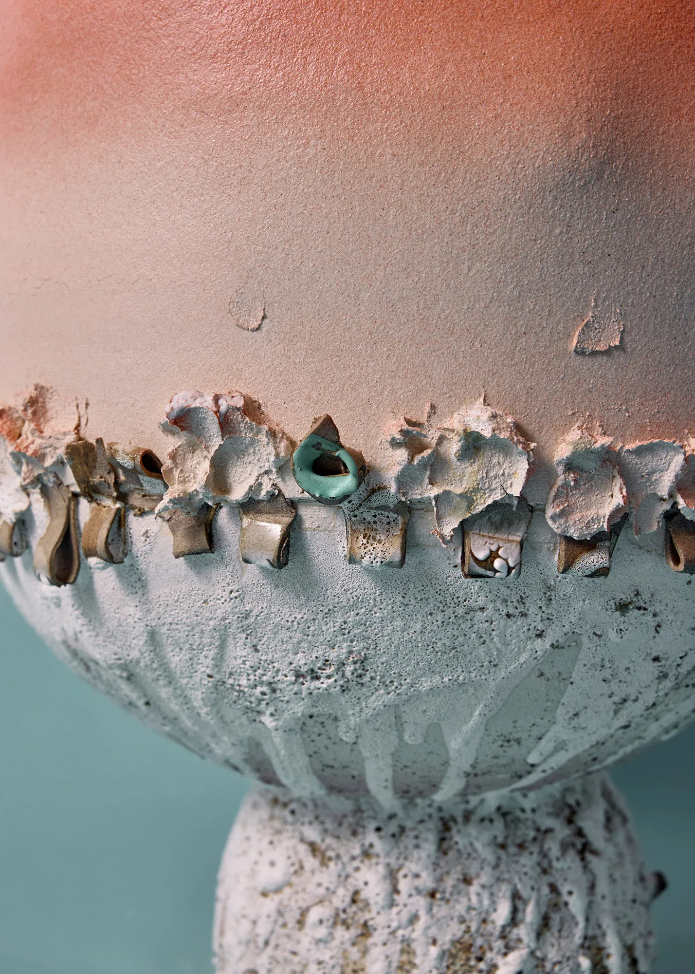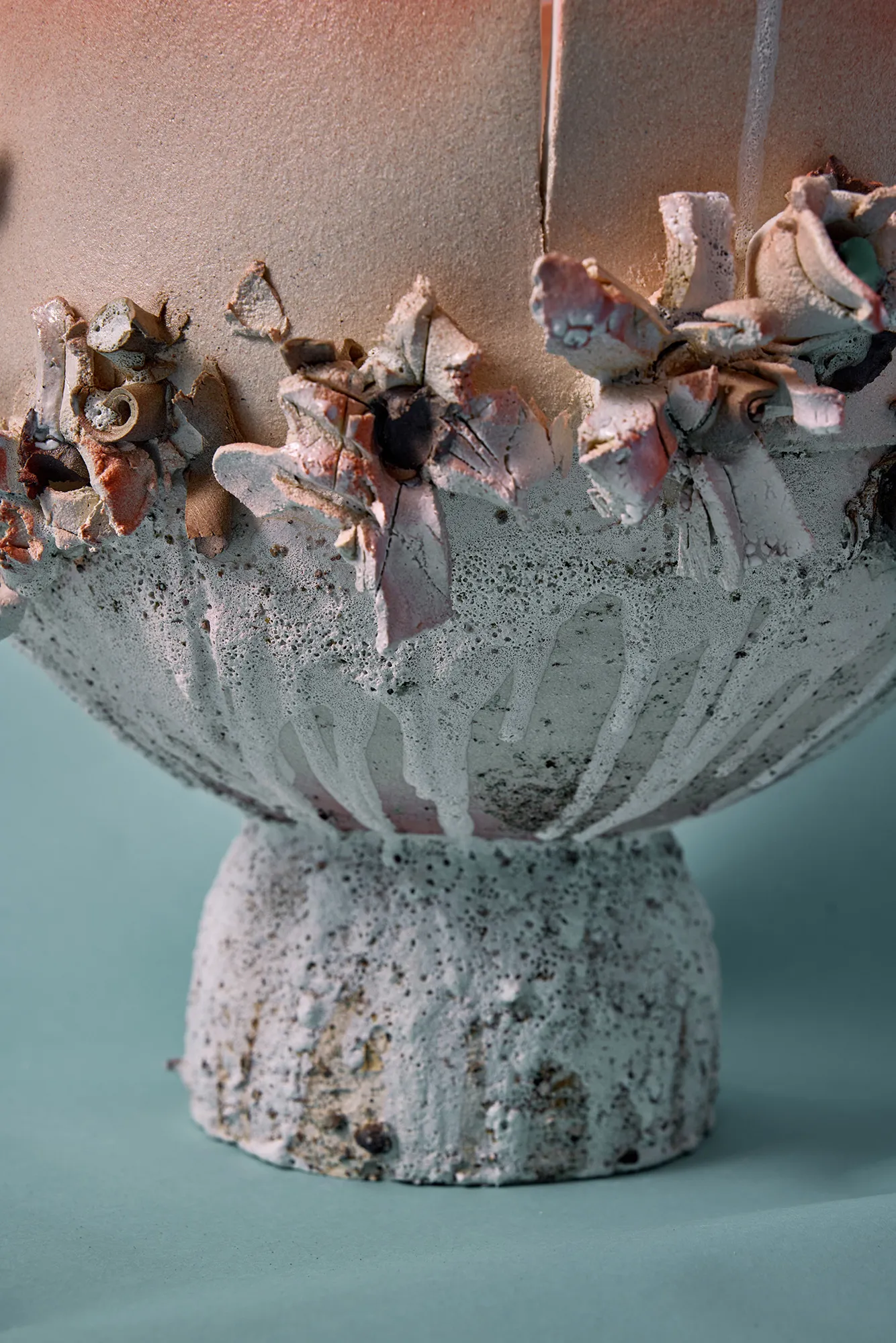 Ceramic vessel for water use, made from white stoneware clay with porcelain details, various glazes.