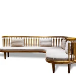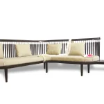 This L-shaped sofa features a striking design, with a structure that evokes the abstract form of a reclining human figure. Carefully constructed from solid teak wood, it incorporates elegant details in brass or stainless steel, showcasing a seamless interplay of materials. One end of the sofa extends into a distinctive circular element, enhancing both its aesthetic appeal and functionality.
