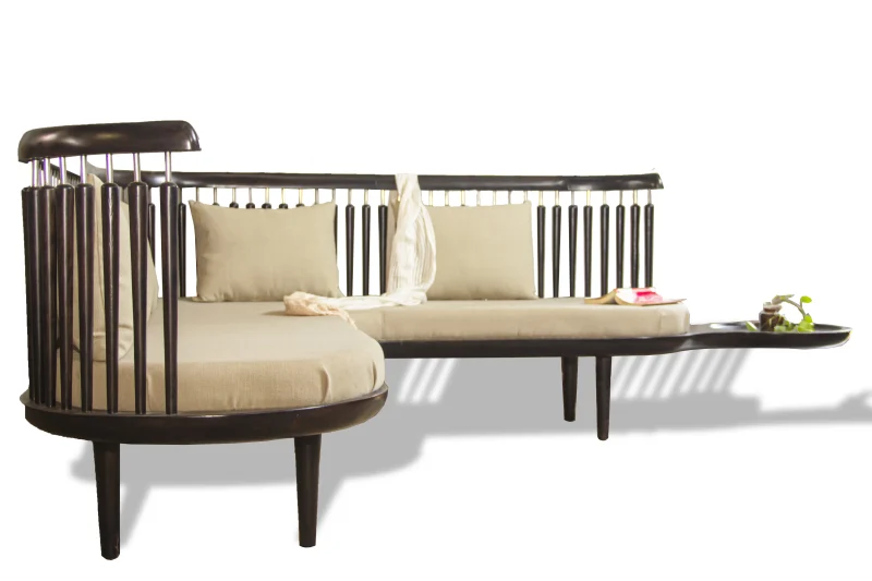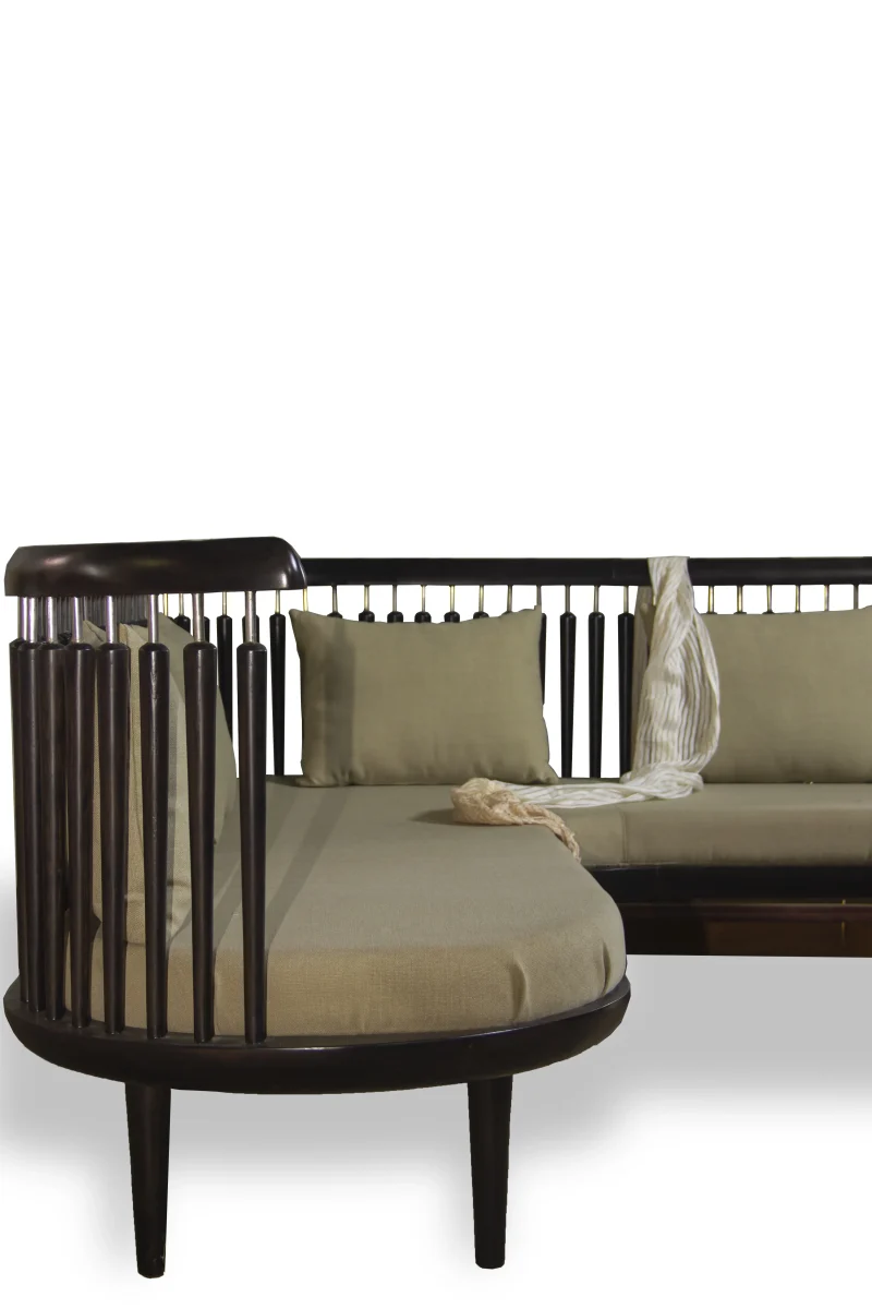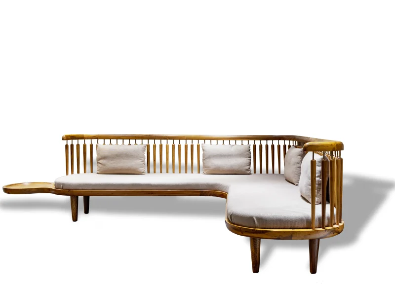 This L-shaped sofa features a striking design, with a structure that evokes the abstract form of a reclining human figure. Carefully constructed from solid teak wood, it incorporates elegant details in brass or stainless steel, showcasing a seamless interplay of materials. One end of the sofa extends into a distinctive circular element, enhancing both its aesthetic appeal and functionality.
