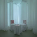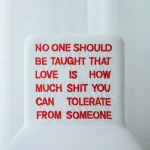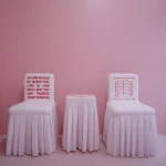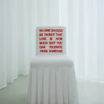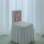 “No-One-Should” chair is inspired by the artistic form of classical Chinese furniture and modern Chinese red-letter slogans. It is covered in cotton fabric (white) or fine silk (other color options), hand-embroidered with a text about domestic violence and trauma.