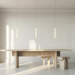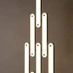The system invites play, and can be hung on a wall horizontally or vertically as a sconce; in an arc or on an angle as a pendant, or set in place as a table lamp. This adaptability makes it marketable for both private and commercial projects.
