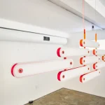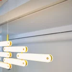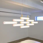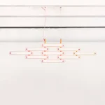 The system invites play, and can be hung on a wall horizontally or vertically as a sconce; in an arc or on an angle as a pendant, or set in place as a table lamp. This adaptability makes it marketable for both private and commercial projects.