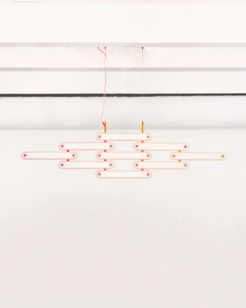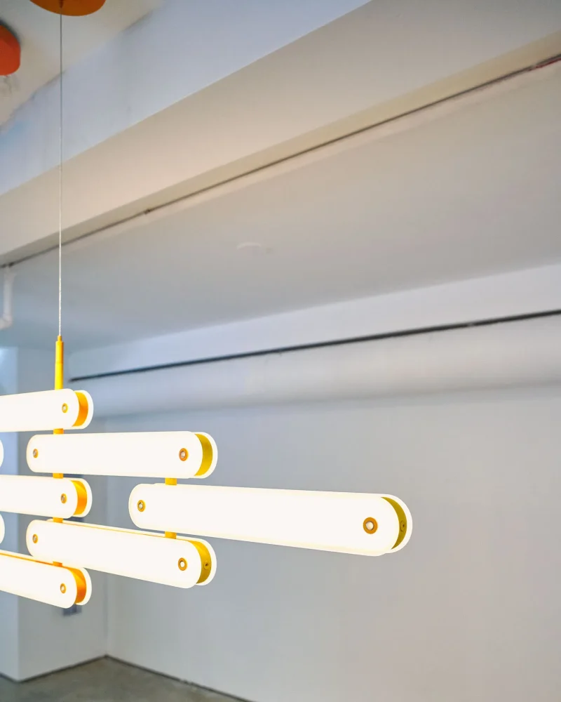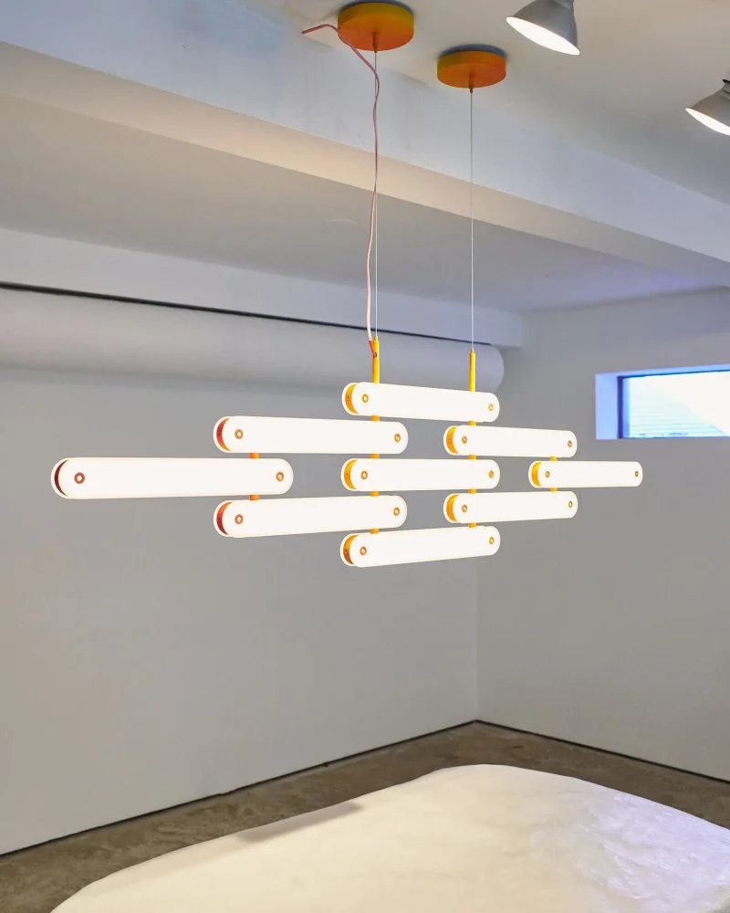 The system invites play, and can be hung on a wall horizontally or vertically as a sconce; in an arc or on an angle as a pendant, or set in place as a table lamp. This adaptability makes it marketable for both private and commercial projects.