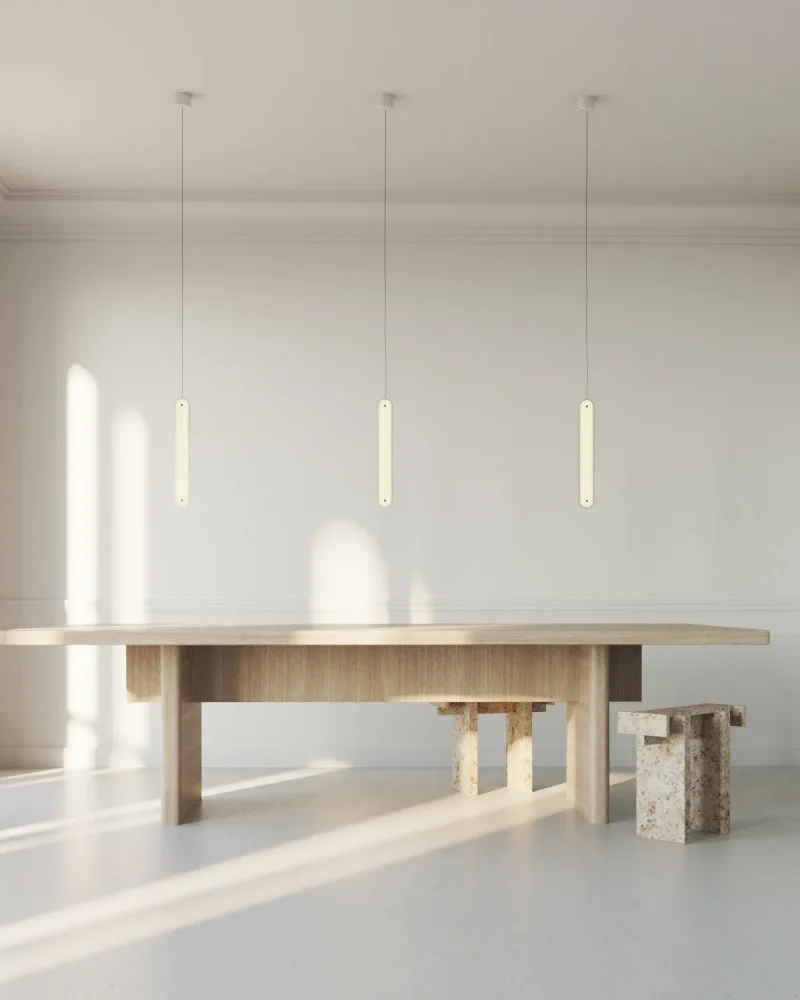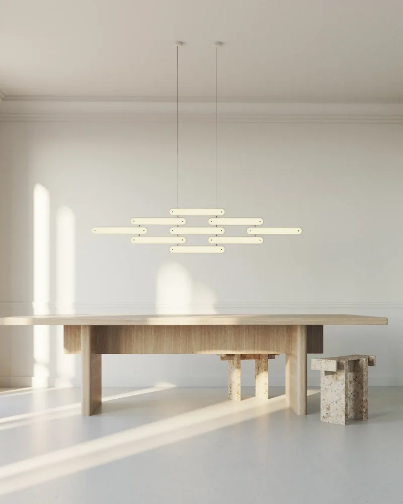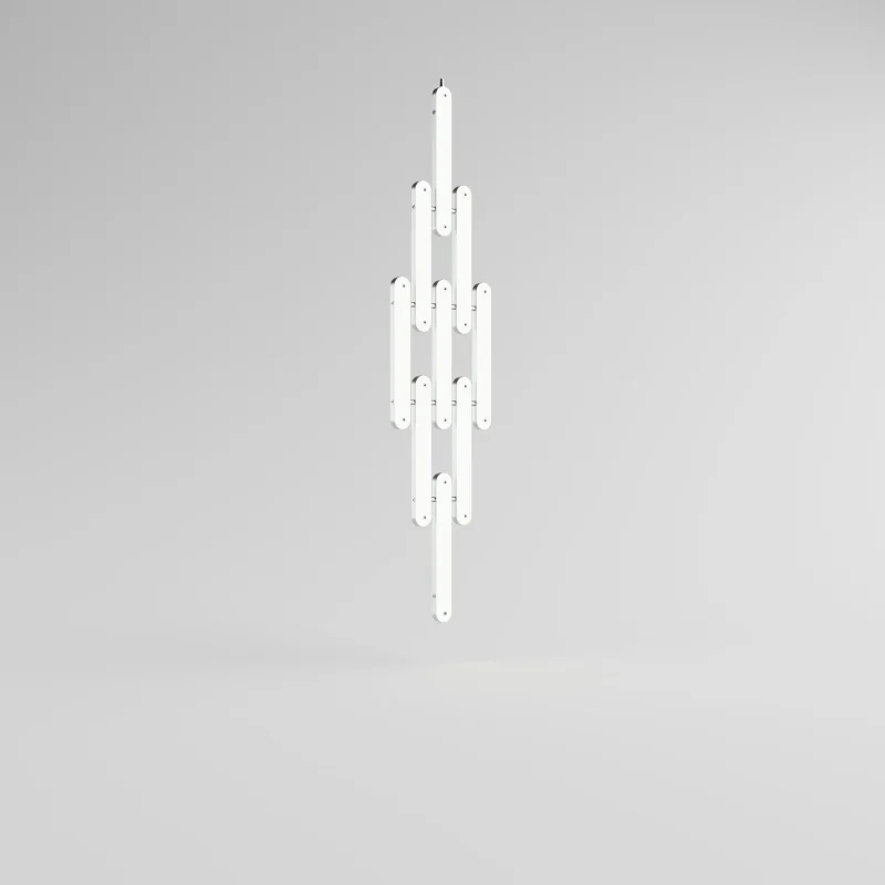 The system invites play, and can be hung on a wall horizontally or vertically as a sconce; in an arc or on an angle as a pendant, or set in place as a table lamp. This adaptability makes it marketable for both private and commercial projects.