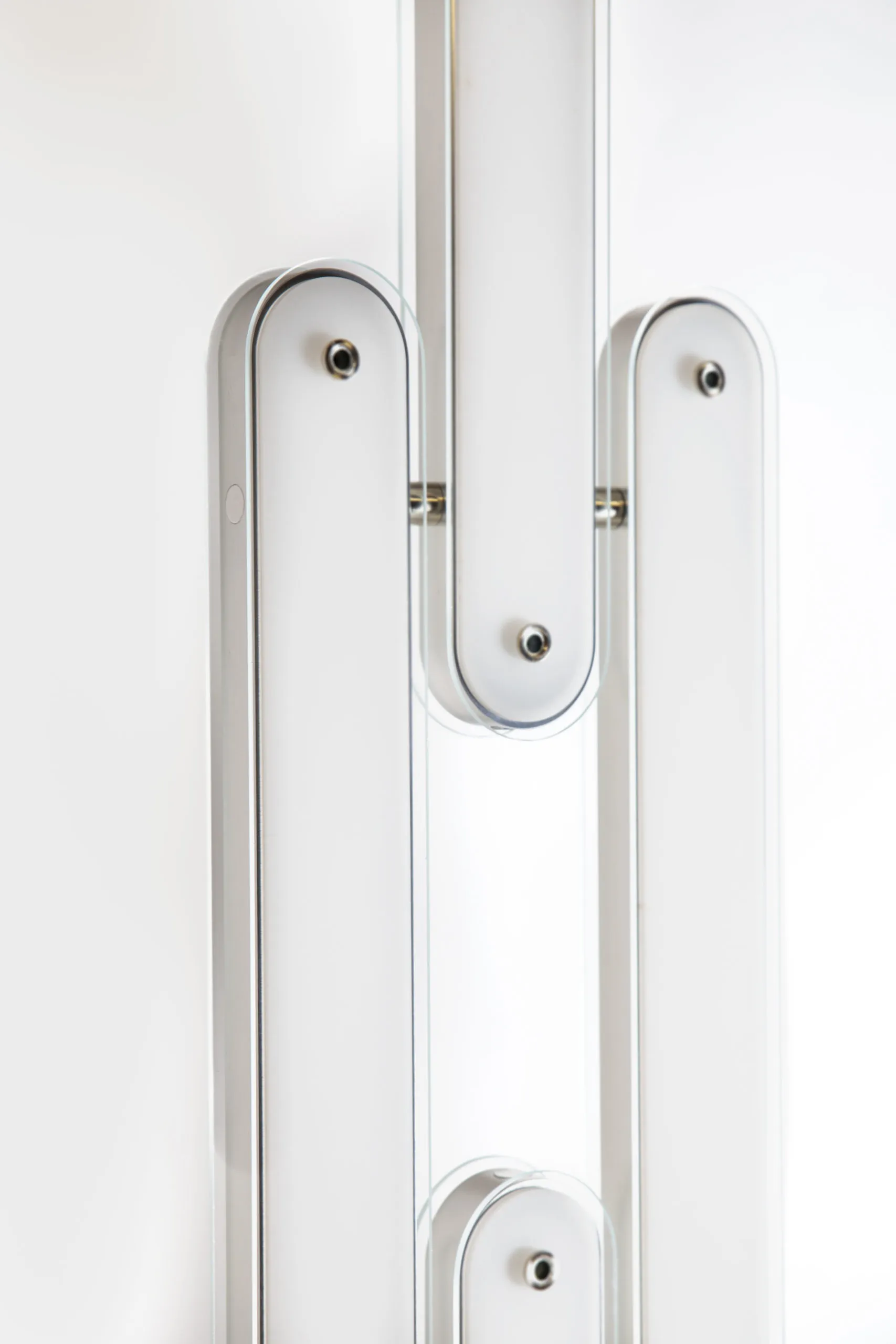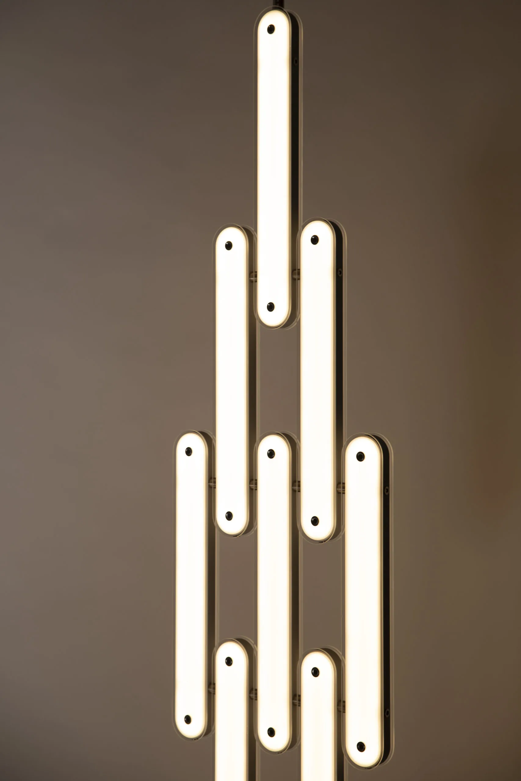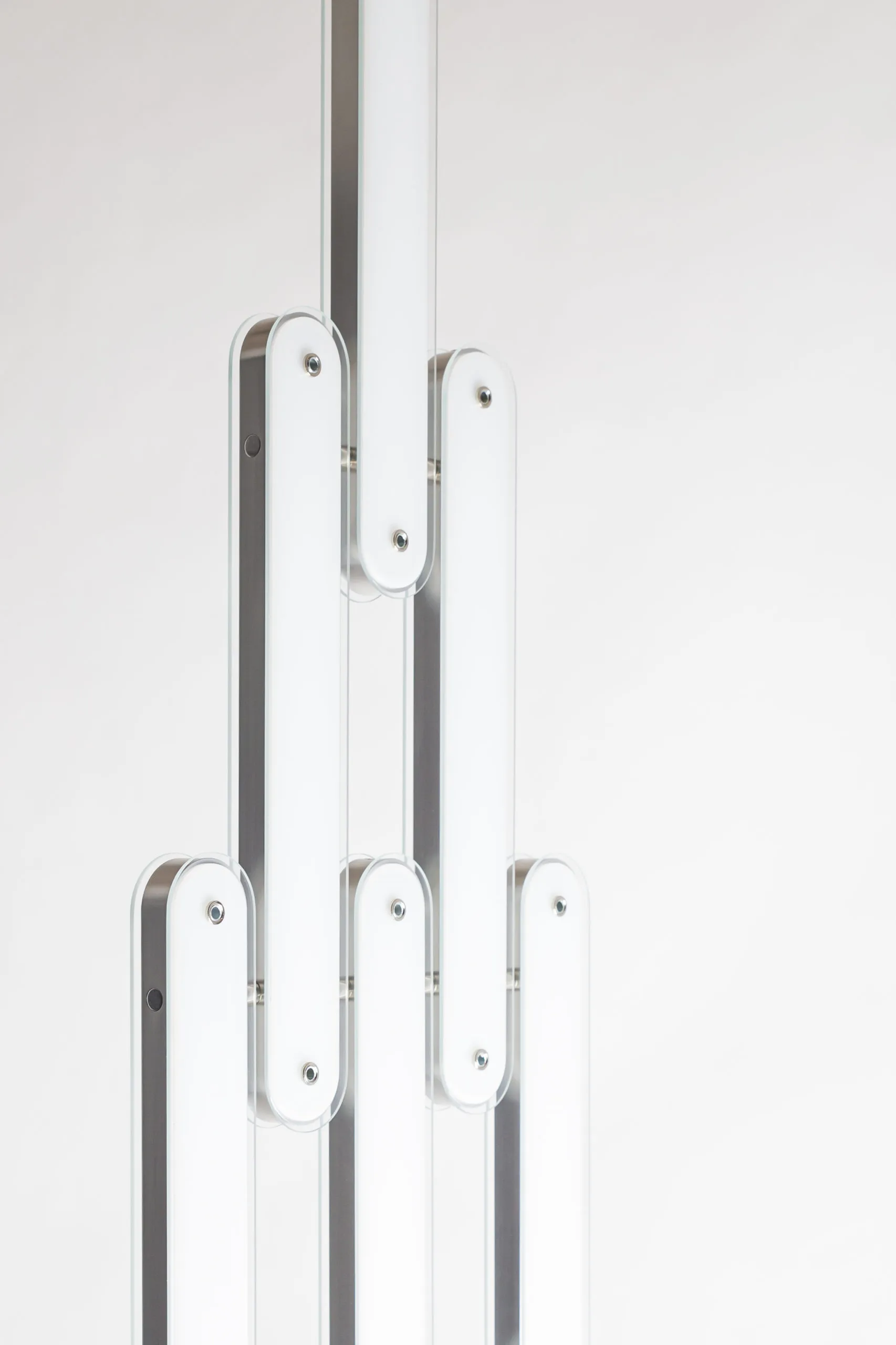Each Node module is made of a 18”x2.5”x1.3” brushed aluminum housing with blackened steel hardware, LEDs and a flashed opal glass panel on each face. The glass panels are offset slightly from the LED strip with a metal washer, to create a soft and omnidirectional light.