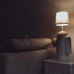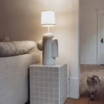 Nodo is a sculptural, minimal lamp handcrafted from speckled stoneware. Its long neck rises from a three-piece wheel-thrown structure, with a matte white glaze covering half the surface to highlight texture and form. Topped with a small, minimal shade, the lamp casts a soft, warm glow.