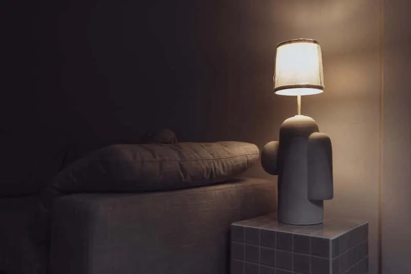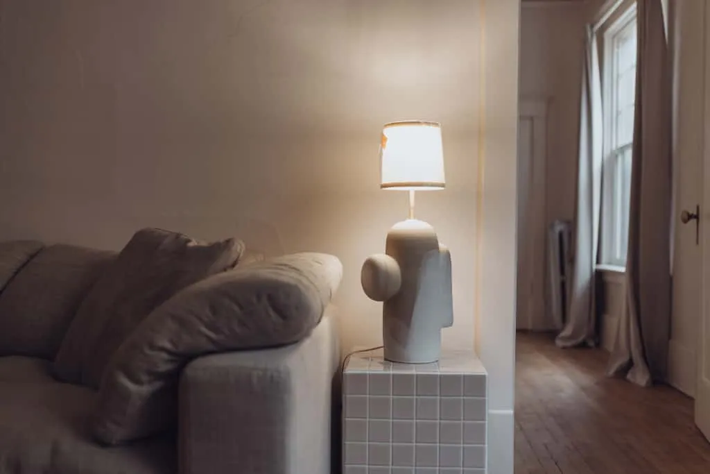 Nodo is a sculptural, minimal lamp handcrafted from speckled stoneware. Its long neck rises from a three-piece wheel-thrown structure, with a matte white glaze covering half the surface to highlight texture and form. Topped with a small, minimal shade, the lamp casts a soft, warm glow.