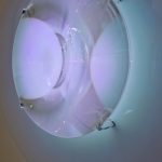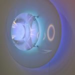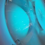 The lamp’s central element changes shape as the viewer moves around the piece with the aid of holographic technology. The light is reflected in a dazzling, yet subtle array of curved shapes. The luminaire incorporates dichromatic filters, which create the effect of color-shifting. Depending on the angle from which it is viewed and the surrounding light, the material creates a whole spectrum of lights, reflections, and shadows.