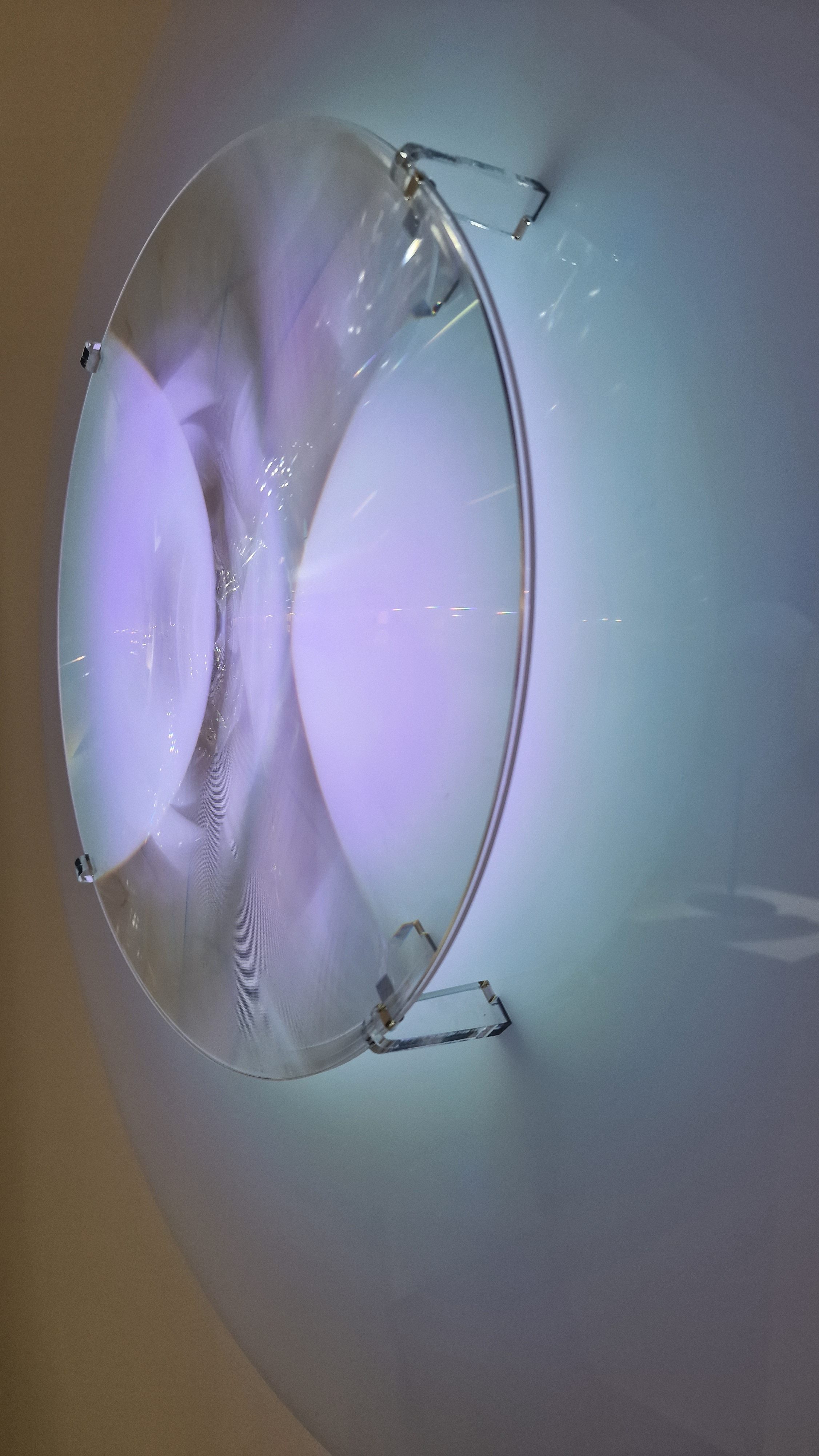 The lamp’s central element changes shape as the viewer moves around the piece with the aid of holographic technology. The light is reflected in a dazzling, yet subtle array of curved shapes. The luminaire incorporates dichromatic filters, which create the effect of color-shifting. Depending on the angle from which it is viewed and the surrounding light, the material creates a whole spectrum of lights, reflections, and shadows.
