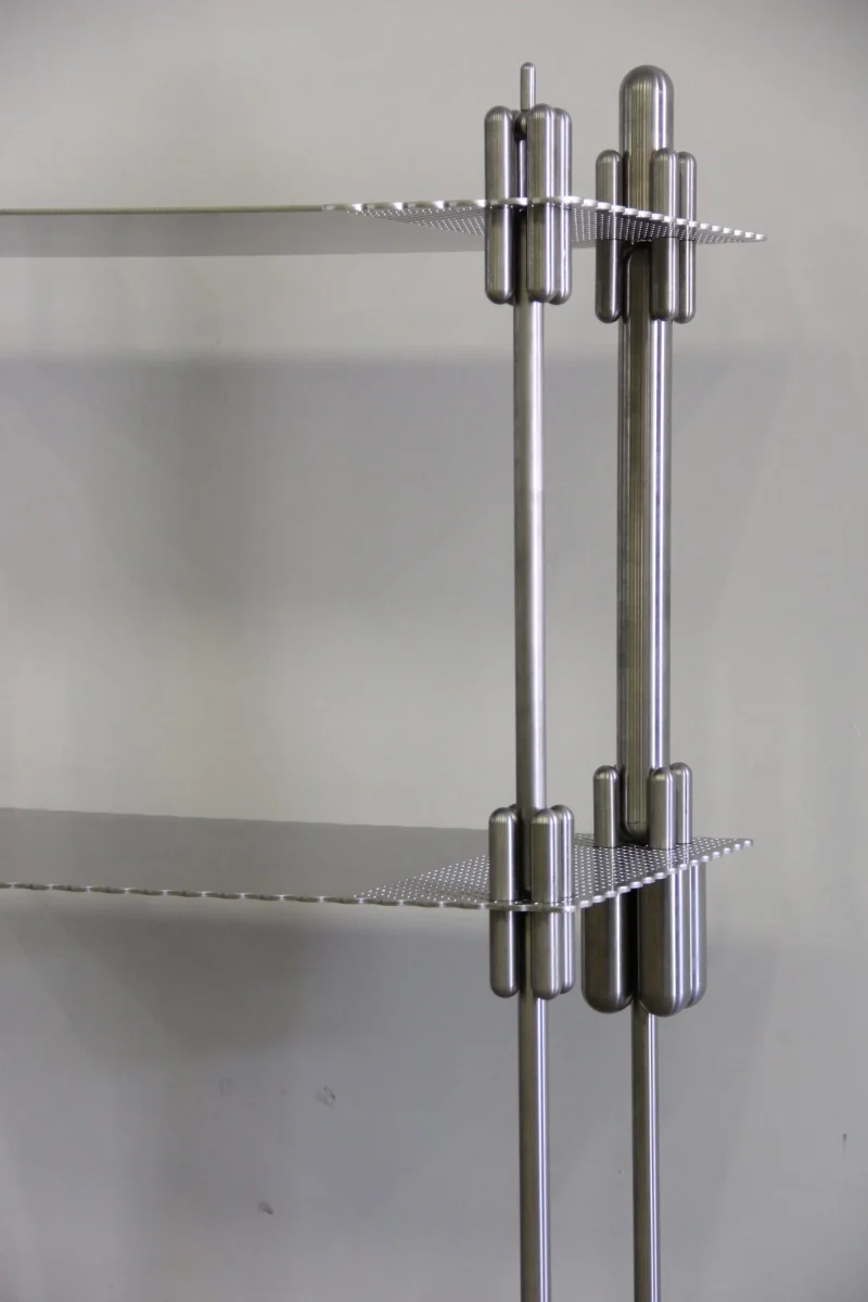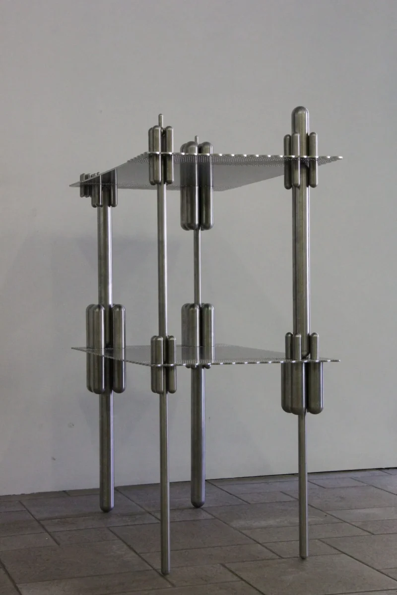 Nopper is a modular system for building a cupboard or a desk. The construction originated from research into plastic building toy blocks for children. The plastic parts with small studs can easily be attached to each other. This principle has been simplified by attaching four or more studs above and below a shelf and clamping a loose leg between them.