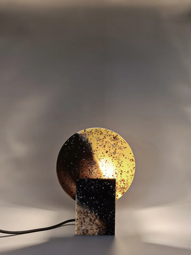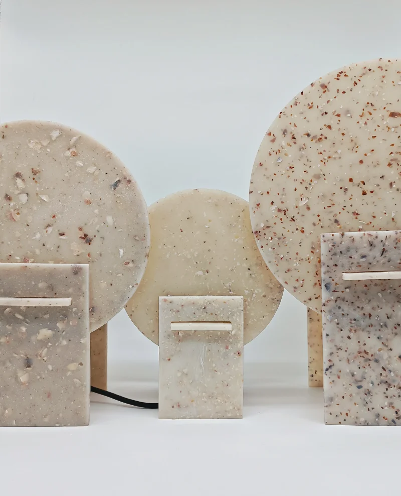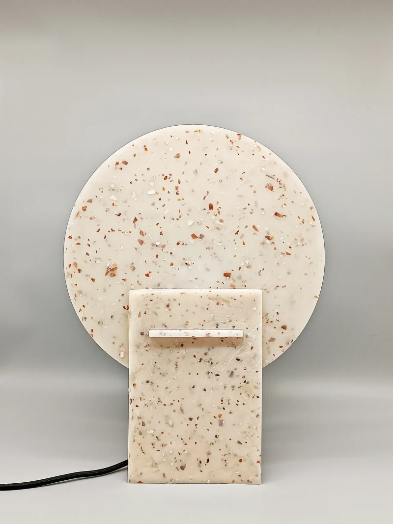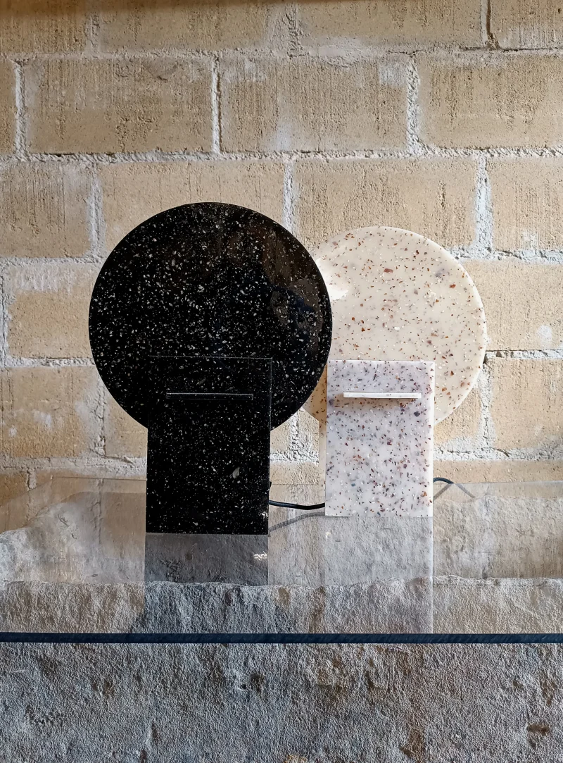 Monadre Lamp by Clémence Joséphine Touzet won the first prize of Métiers d’Art (arts and crafts) de France in 2024, due to its harmonic shapes and sustainable material. Inspired by the desire to create an ambient light with a sculptural quality. Composed of two square bases and two discs, the geometric shape modifies the lamp’s expression depending on its position. The Monadre lamp combines functionality and aesthetics to create a unique, versatile lamp. It is entirely composed of VEGETAL GLASS ® and for this collection of recycled Mother-of-Pearl. The production process starts with collecting shells- rubbish from local industries or local oyster farms and using recycled oyster or mussel shells instead of stones. Monadre is completely organic and handmade in France.