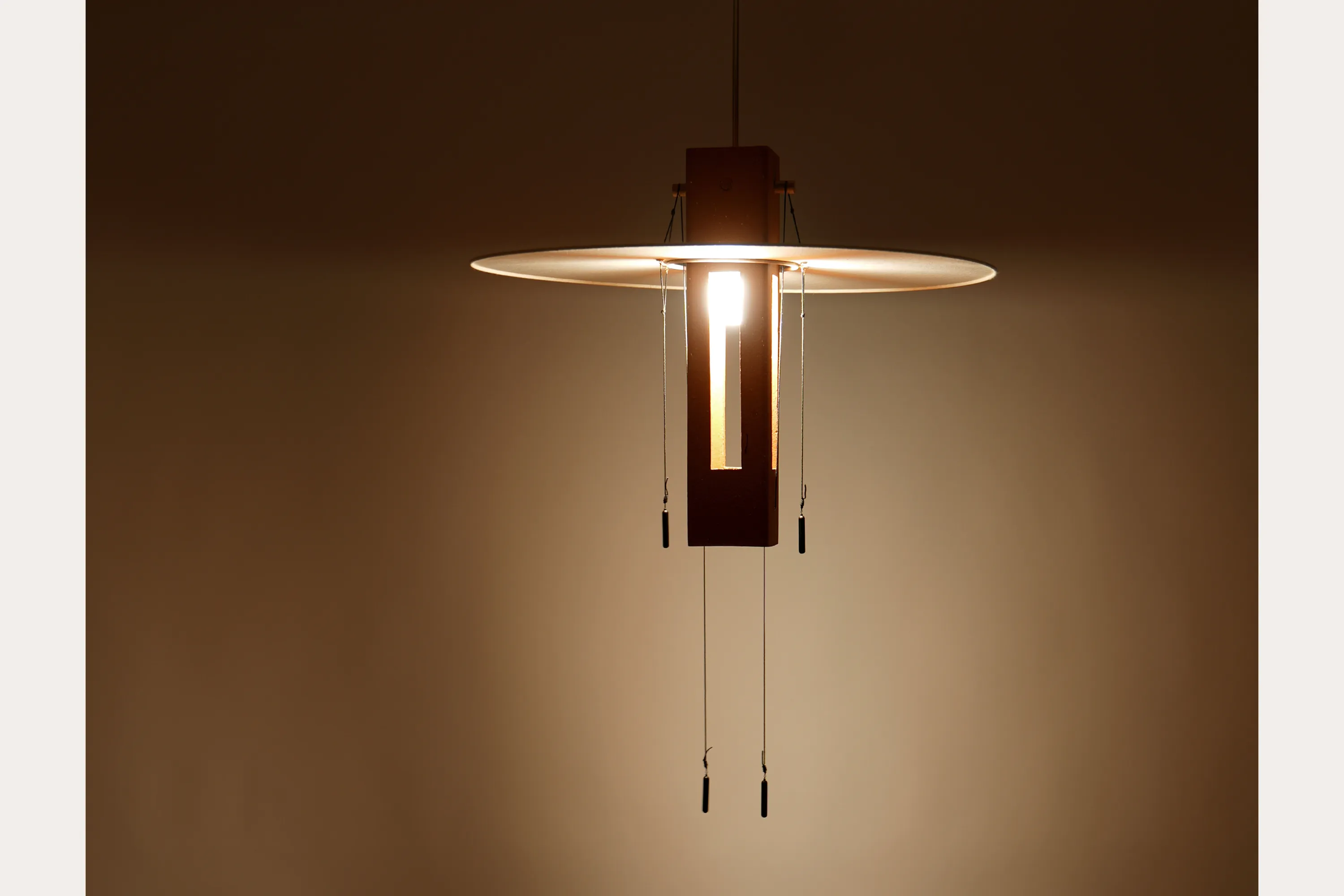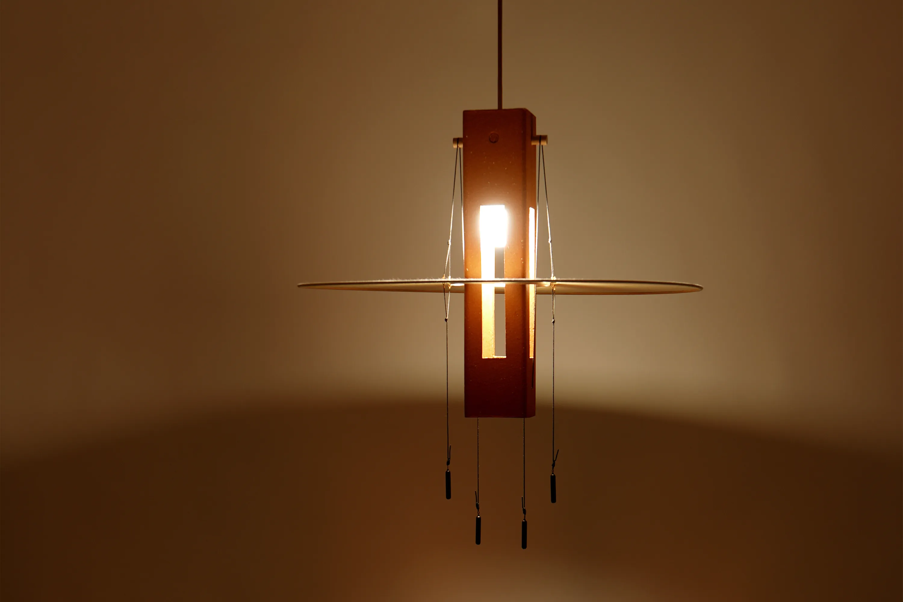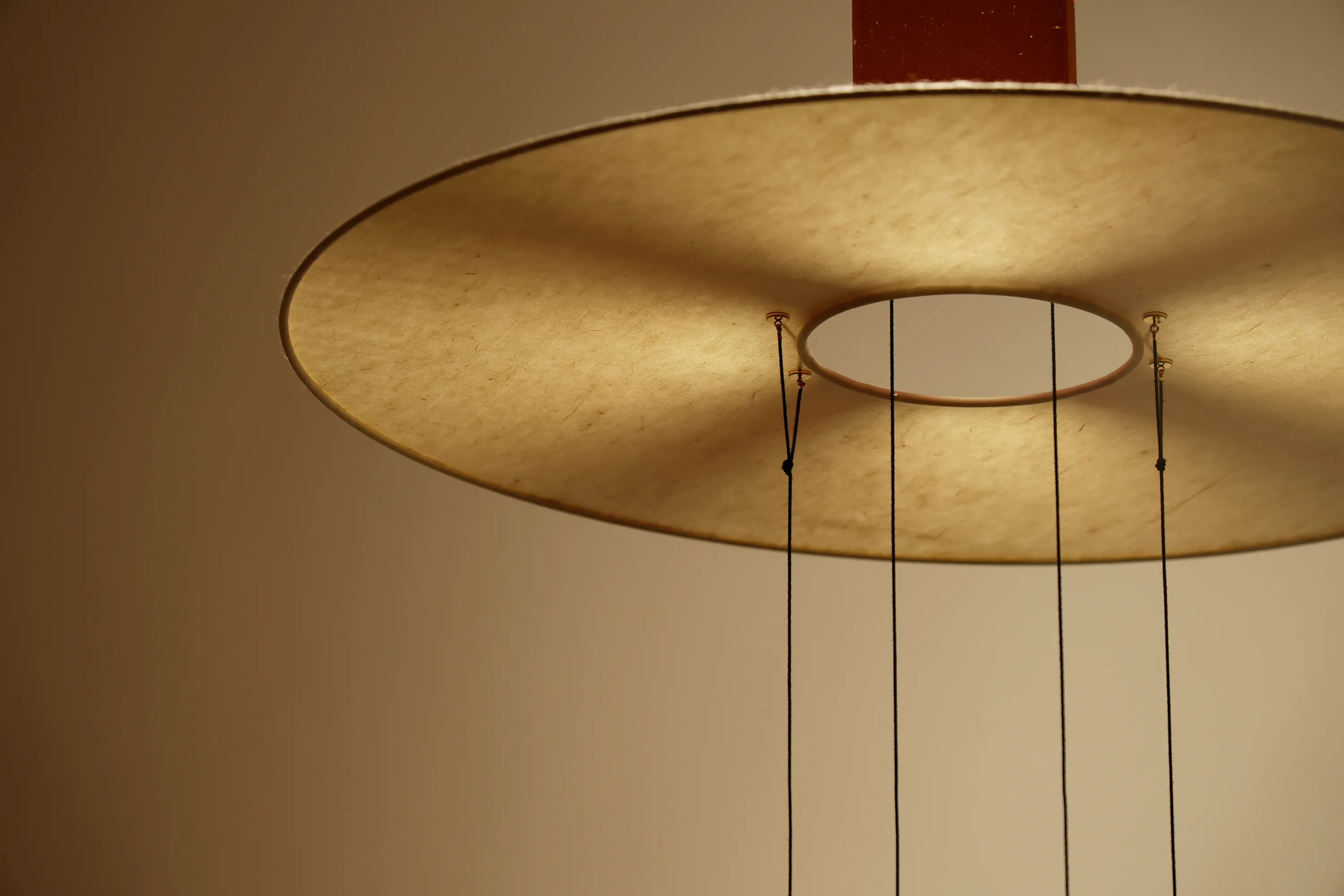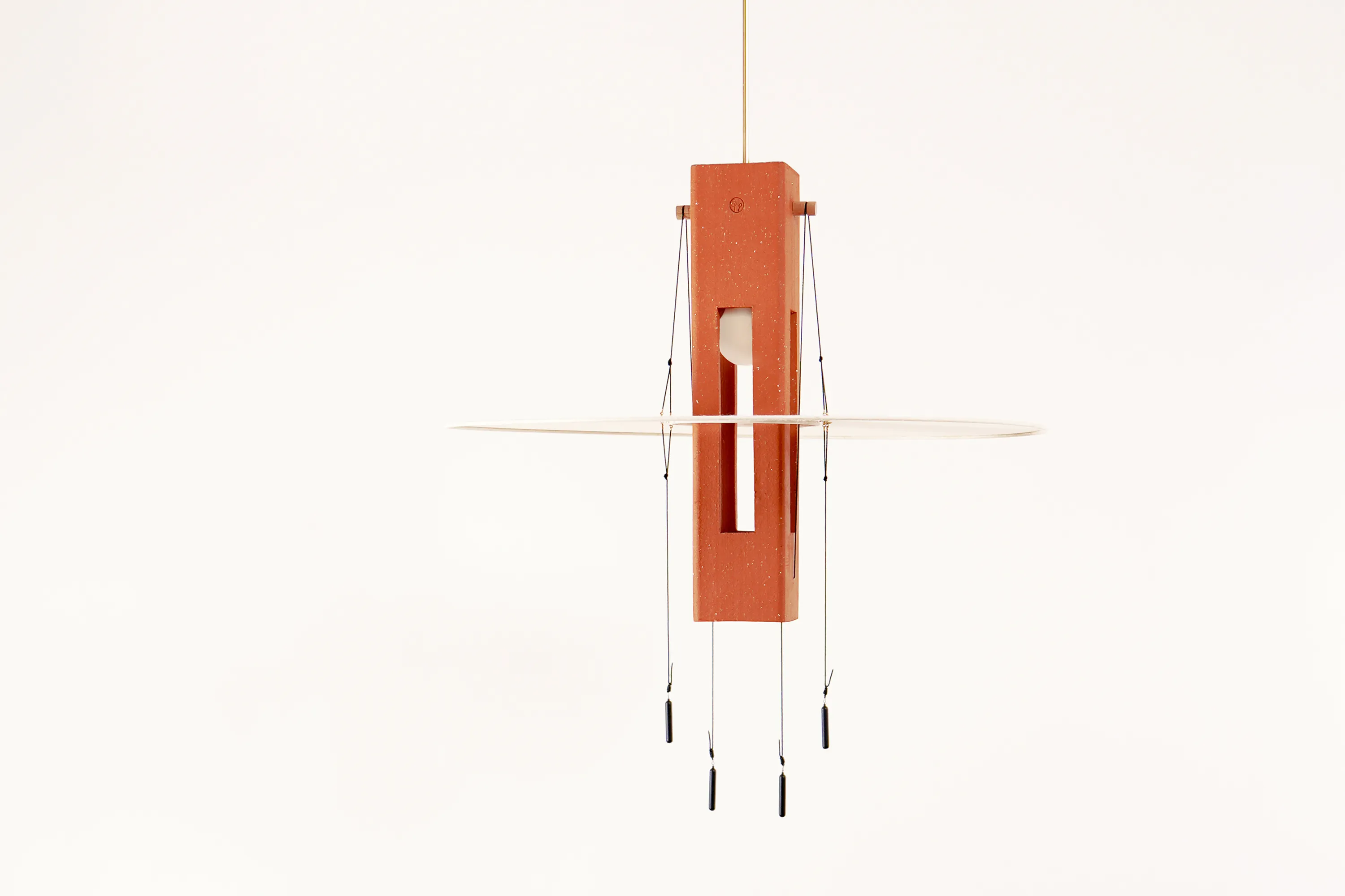 With its square, architectural base and its delicate paper ring, Nova evokes the silhouette of an ancient tower shimmering under the midday sun. By day, its sculptural presence anchors the space; by night, it diffuses a warm, celestial glow—like light filtered through a cloud.
