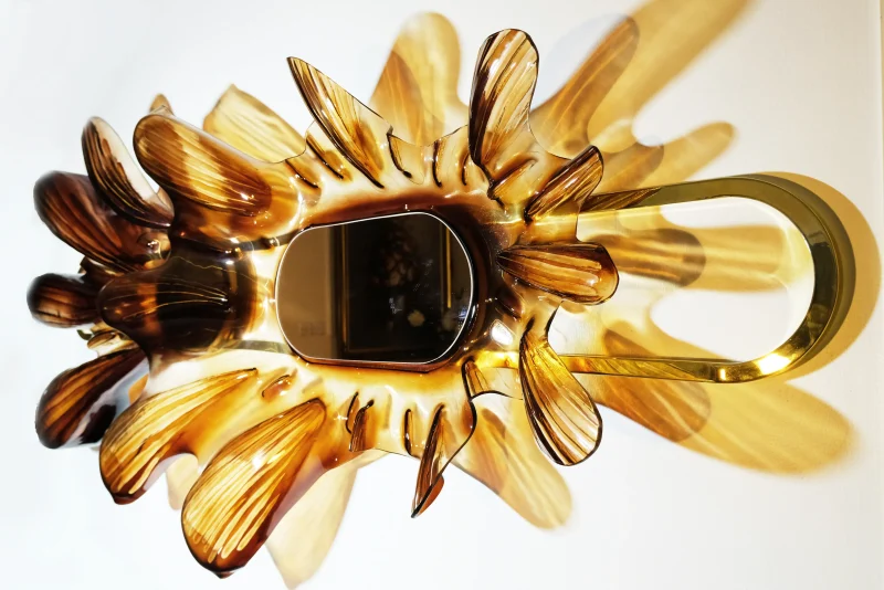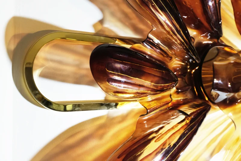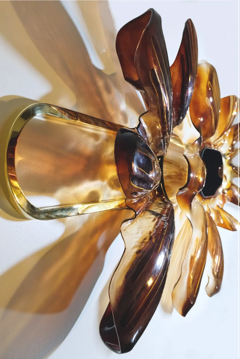 Born from a fascination with marine creatures and glass-forming research and experimentation, Nudi Brown by Whymsicals is the second in the Nudi series, exploring the overlapping of glass in space with reflections and refractions of color. The composition displays complete freedom to the glass petal-like edges, creating an illusion of frozen motion in space. Nudi Brown functions as a mirror and light feature.