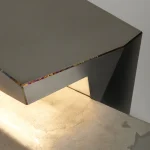 Silver leaf was applied to the curved surfaces that reflect light, contrasting with the smooth texture of stainless steel and emphasizing the heat-tinting effects of welding to create a difference in coloration.