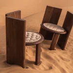 The stool from the Objects of Legacy collection by Jagdish Sutar features a unique three-legged design that offers dual seating arrangements with configurable changes, presenting a fresh perspective on comfort and making it a versatile piece. The elongated legs serve as both the backrest and armrest, providing a graceful seating experience from different angles.