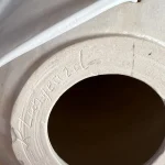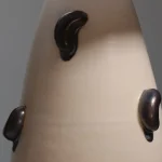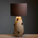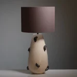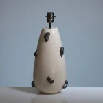 This ceramic lamp by Katia Langeard exudes a unique and organic design with its teardrop-shaped base, crafted from smooth, creamy beige ceramic. The base is adorned with playful, metallic, bean-like shapes that add contrast, making it an artful statement piece. Topped with a fabric, dark brown lampshade (diameter 22cm x height 30cm), this lamp brings warmth and a touch of whimsical charm to any space. Perfect for adding a bold and artistic accent to your interior.