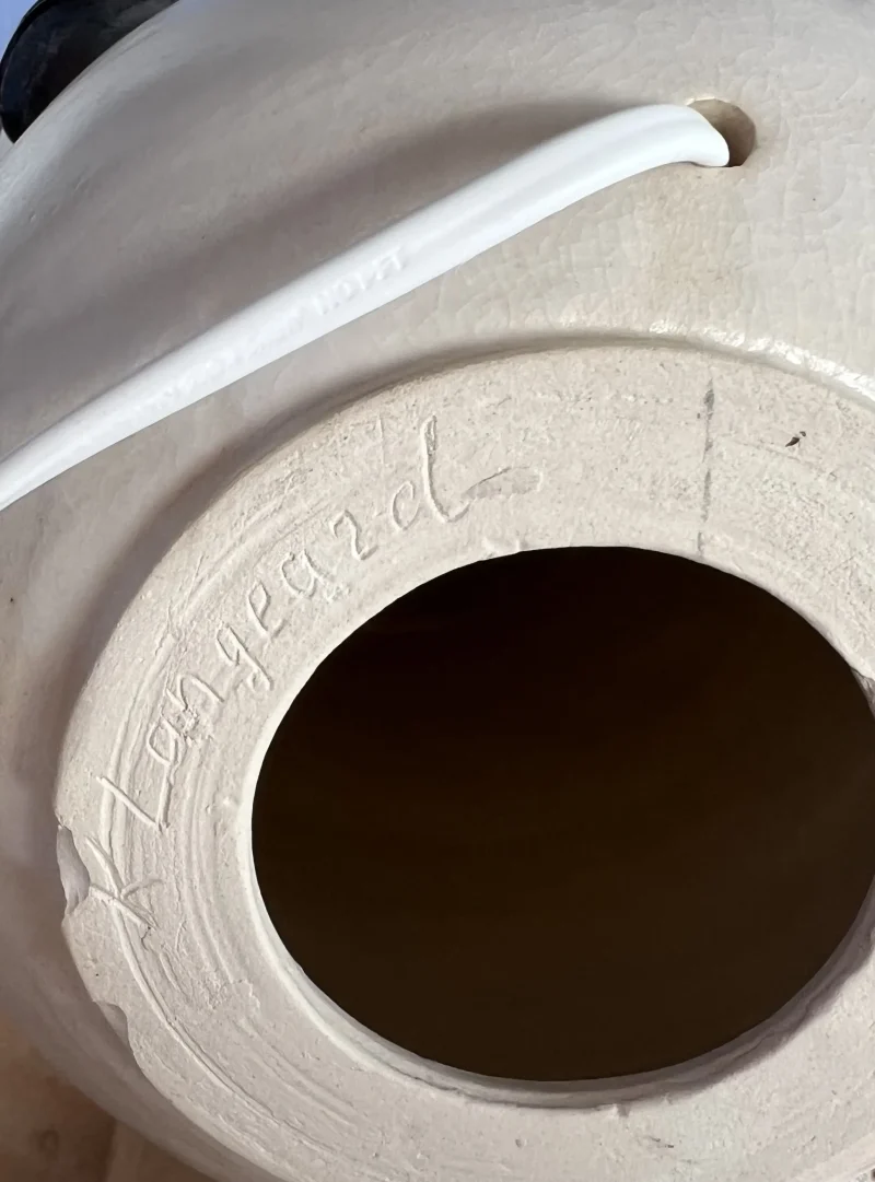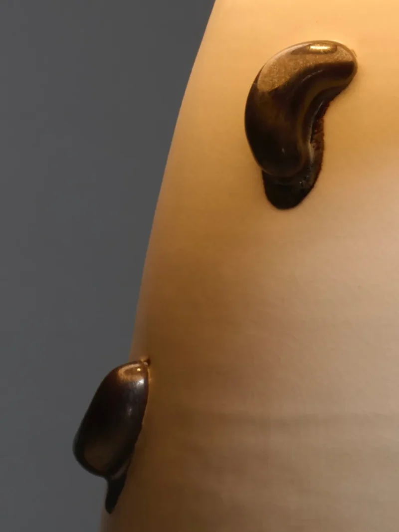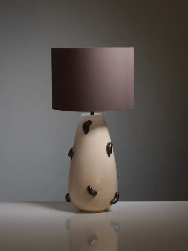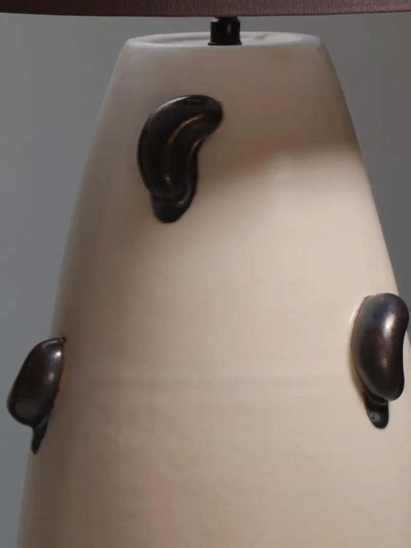 This ceramic lamp by Katia Langeard exudes a unique and organic design with its teardrop-shaped base, crafted from smooth, creamy beige ceramic. The base is adorned with playful, metallic, bean-like shapes that add contrast, making it an artful statement piece. Topped with a fabric, dark brown lampshade (diameter 22cm x height 30cm), this lamp brings warmth and a touch of whimsical charm to any space. Perfect for adding a bold and artistic accent to your interior.