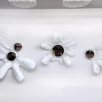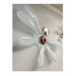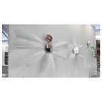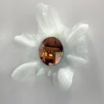 In the piece Ocellus by Whymsicals, patterns of motion and fluctuations of Junonia orithya against wind display a formal transformation on the wings. This, in turn, creates complexity and turbulence in the environment, creating an overall theatrical composition. Through biomimicry, the glass compositions capture this elegance in the innovative process of kiln-formed glass. The process entails producing molds that are first routed and then sculpted.