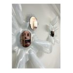 Three kiln-formed glass compositions are frosted and lined white with mirrors and installed on a back steel structure.