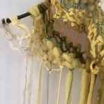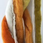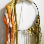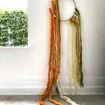 Jeanett Knipschildt felted the long ‘arms’ of “OCTOPUS” from sustainable, 100% Merino wool and hung it around a recycled metal ring. Most wool parts, she dyed from natural wild plants from Denmark. The decorative right part is either yarn/strings/ cotton scraps and most parts have been carted and hand spun from leftover Merino wool and other leftover yarn. A recycled unique logo acrylic piece has been designed and sits within the wool. A black leather string holds the art piece.