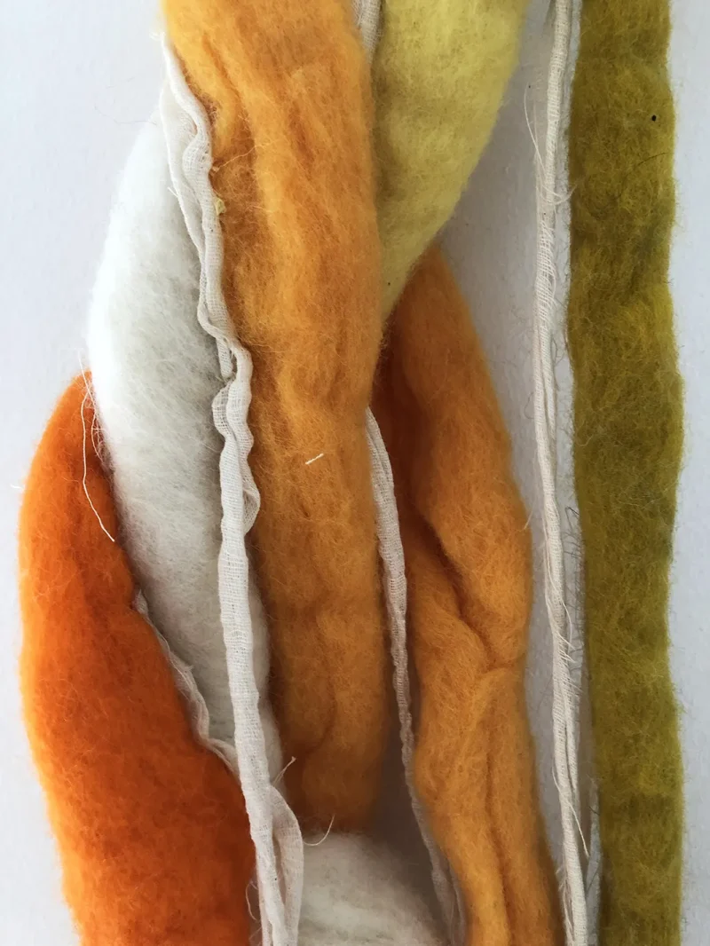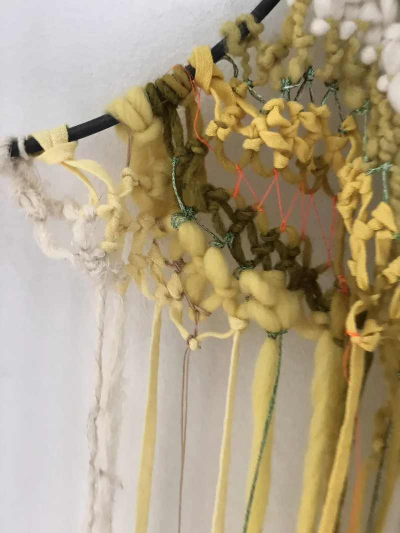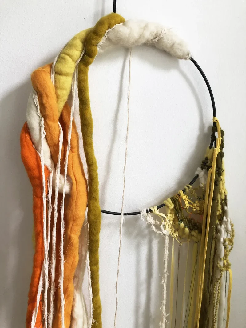 Jeanett Knipschildt felted the long ‘arms’ of “OCTOPUS” from sustainable, 100% Merino wool and hung it around a recycled metal ring. Most wool parts, she dyed from natural wild plants from Denmark. The decorative right part is either yarn/strings/ cotton scraps and most parts have been carted and hand spun from leftover Merino wool and other leftover yarn. A recycled unique logo acrylic piece has been designed and sits within the wool. A black leather string holds the art piece.