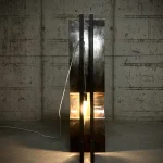 The materials that compose the lamp are 1 bended hand brushed iron 2 wood pieces treated with YAKISUGI technique (a traditional and very ancient Japanese method of wood preservation, based on burning the wood).