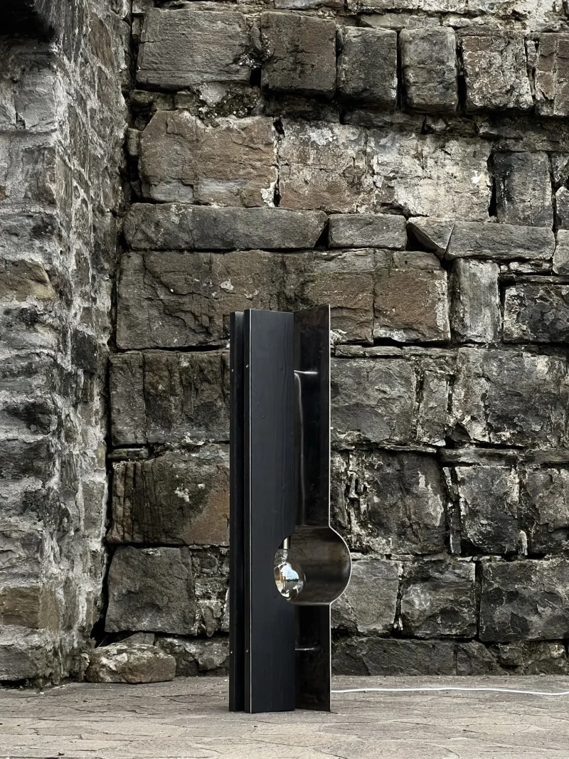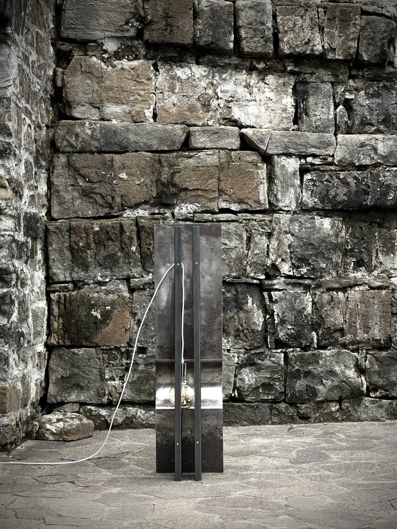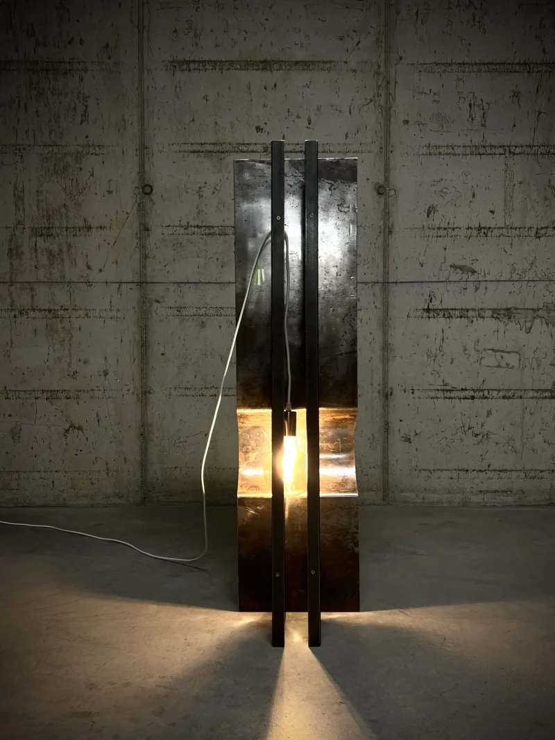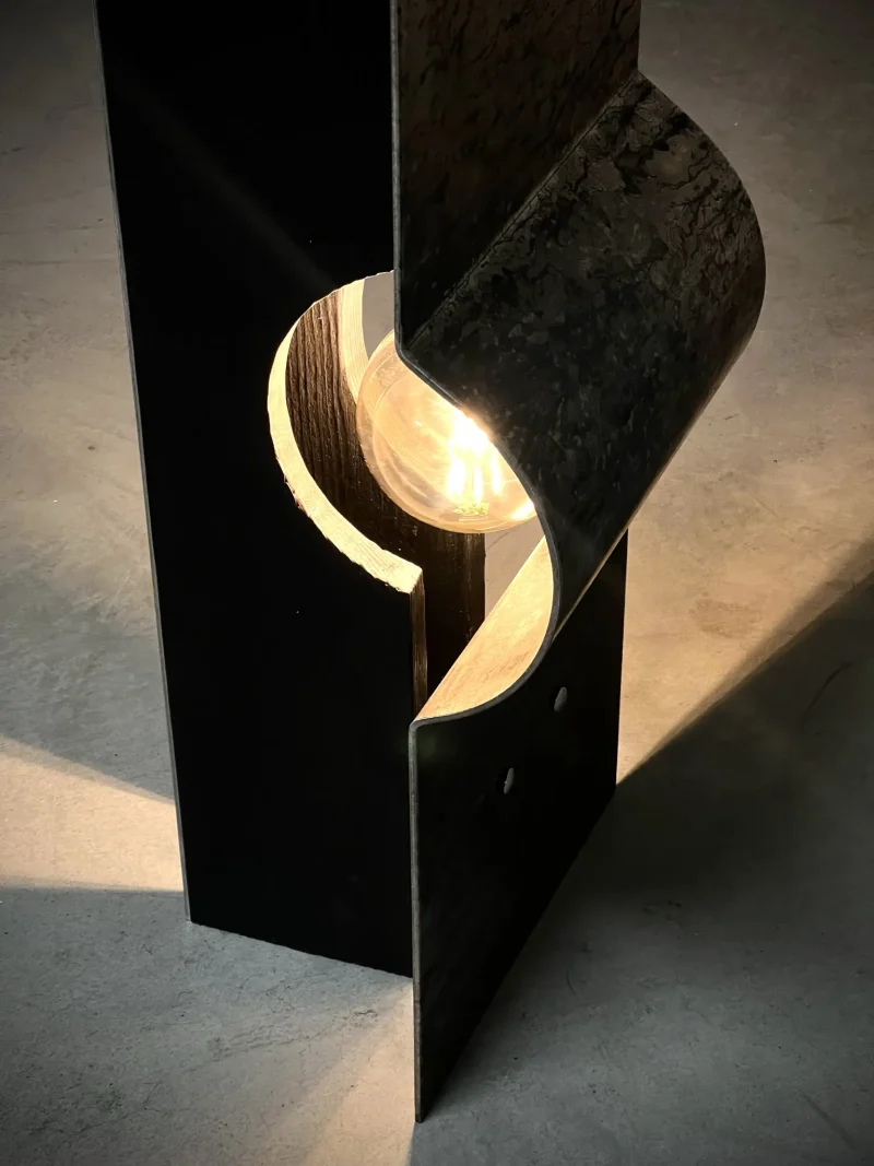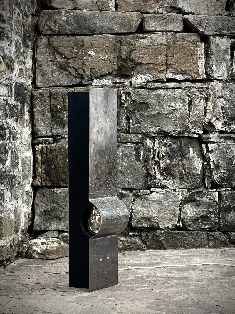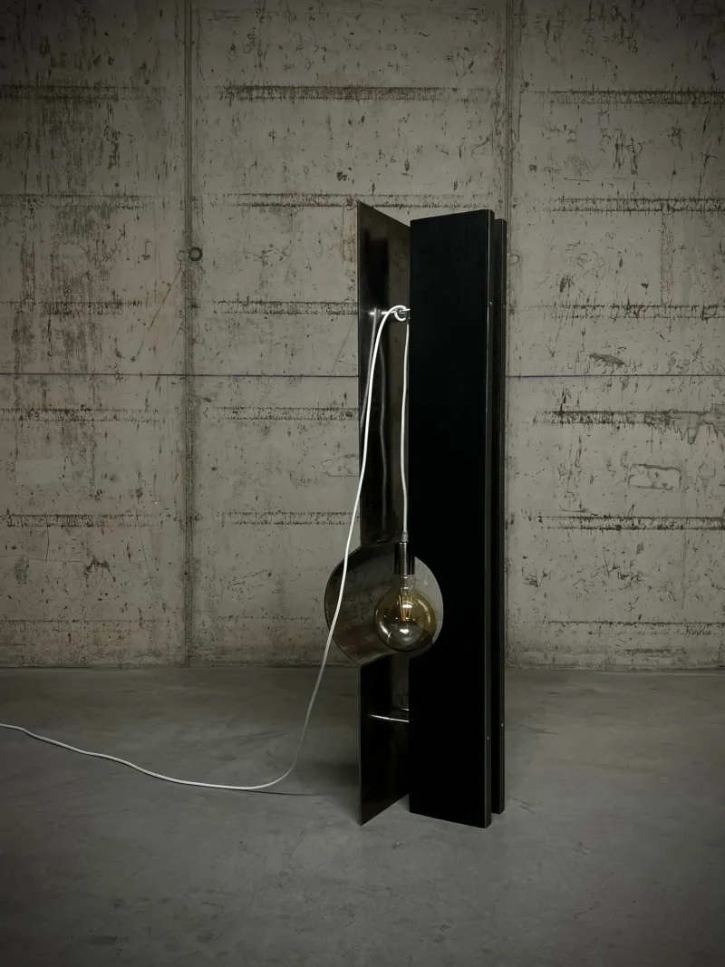 The materials that compose the lamp are 1 bended hand brushed iron 2 wood pieces treated with YAKISUGI technique (a traditional and very ancient Japanese method of wood preservation, based on burning the wood).