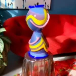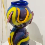 Draping, hand-blown and hand-formed shapes come together in an enlarged nature-like vessel. Her colours are translated into a fantasy craft with residual glass and colours from the glass laboratory.