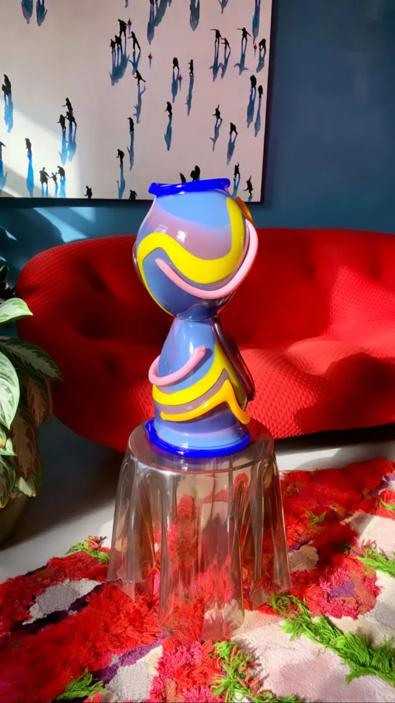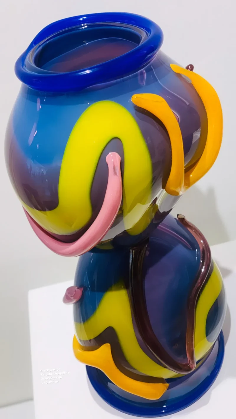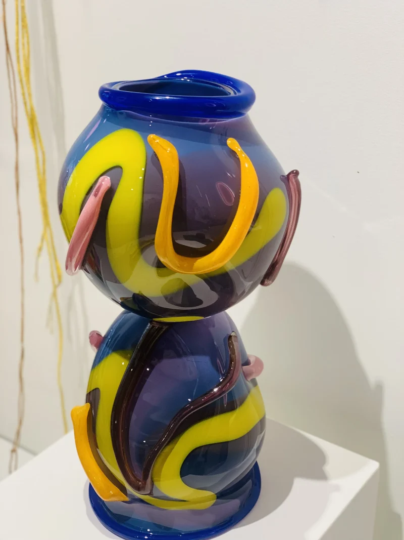 Draping, hand-blown and hand-formed shapes come together in an enlarged nature-like vessel. Her colours are translated into a fantasy craft with residual glass and colours from the glass laboratory.
